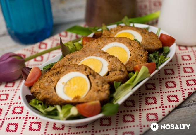 A tojásokat keményre főzzük, meghámozzzuk. A húsos massza felét a formába adagoljuk, majd a tojásokat finoman belenyomjuk. Ezután befedjük a többi hússal. Előmelegített, 190C-os sütőben 40-45 percig sütjük. Hidegen is finom, jól csomagolható, ezért tízóraira vagy munkahelyi ebédnek is kiváló.
