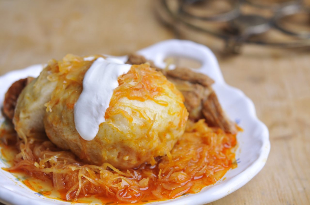 Amíg megfő a hús és a káposzta, gyorsan dagasszuk be a tésztát. Langyos vízben oldjuk fel az élesztőt, egy csipet sót és cukrot, üssük bele a tojást és adunk hozzá – több részletben - annyi lisztet, hogy jó kemény tésztát tudjunk dagasztani belőle. Mikor az már szép sima, akkor egy tiszta konyharuhával lefedve, tegyük meleg helyre (pl. a lábas tetején fordítsuk meg a fedőt, és tegyük rá a tálat).