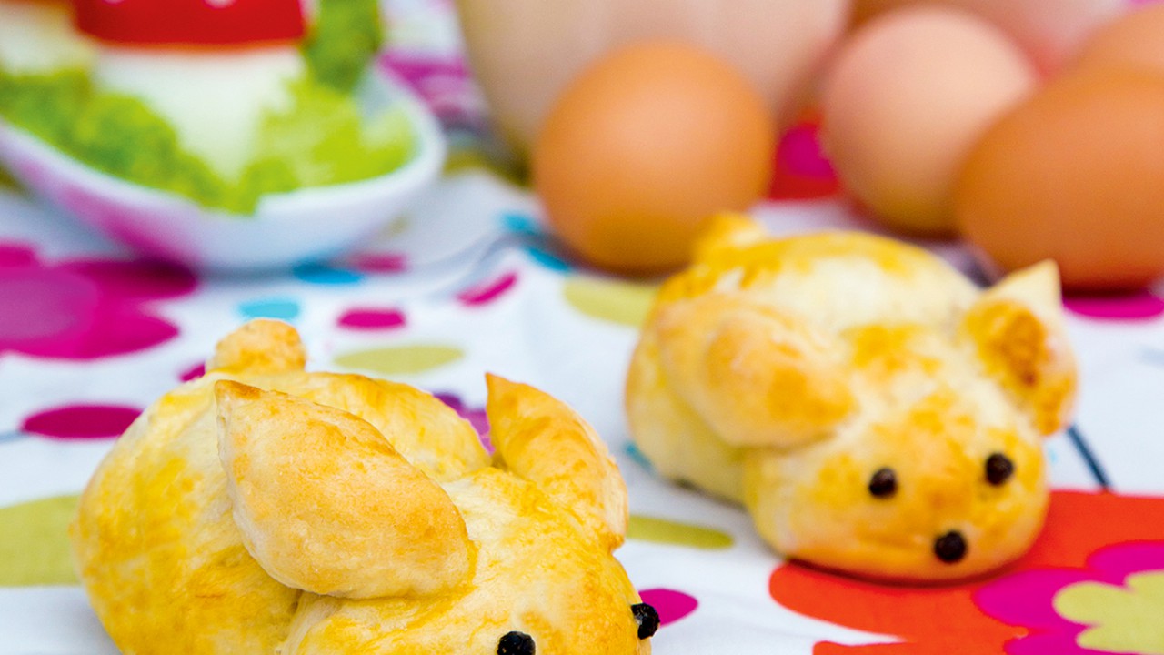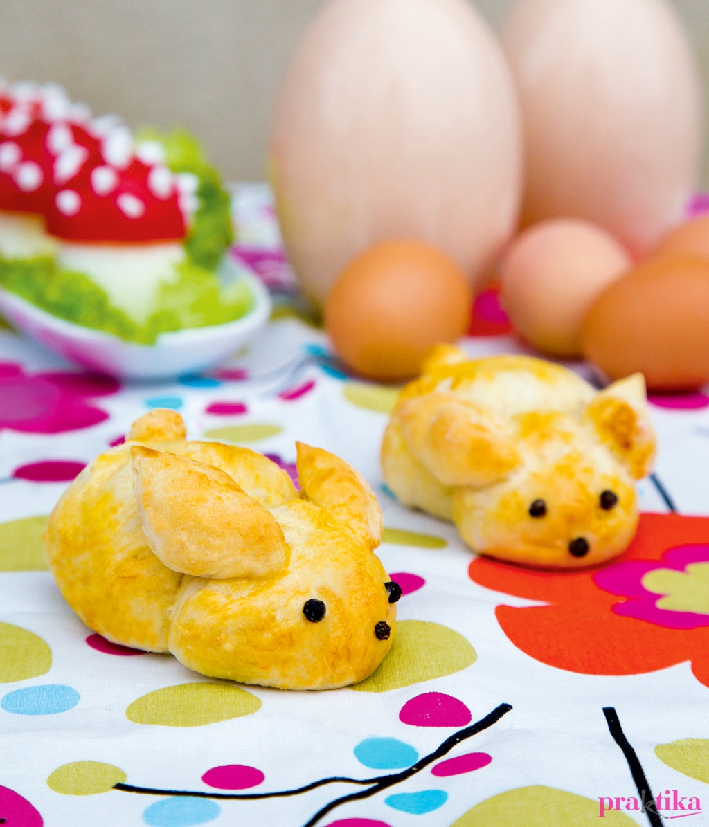 A cipókat fél cm vékony négyzetformára nyújtjuk, és belecsomagoljuk a fél tojásokat. A maradék tésztából készül a nyuszi feje, a fülei és a farka, amit a felvert tojással ragasztunk a testhez. A szemek és orrok borsszemek. A tojással átkent nyuszik 170 fokosra előmelegített sütőben kb. 20 perc alatt elkészülnek.