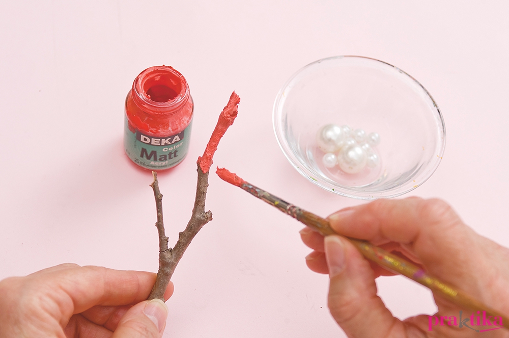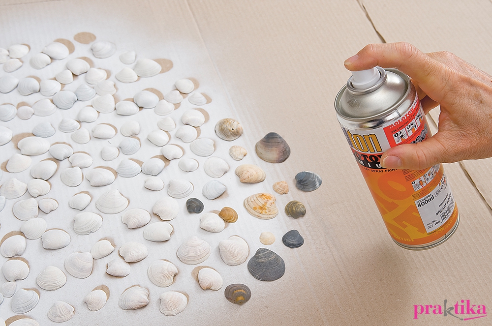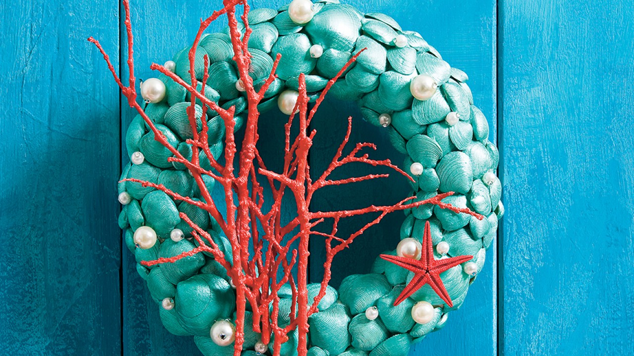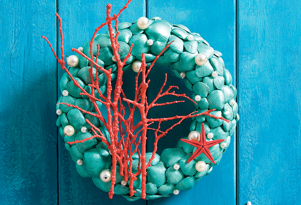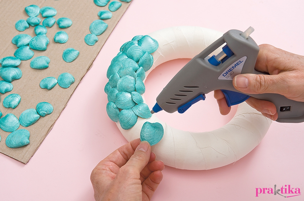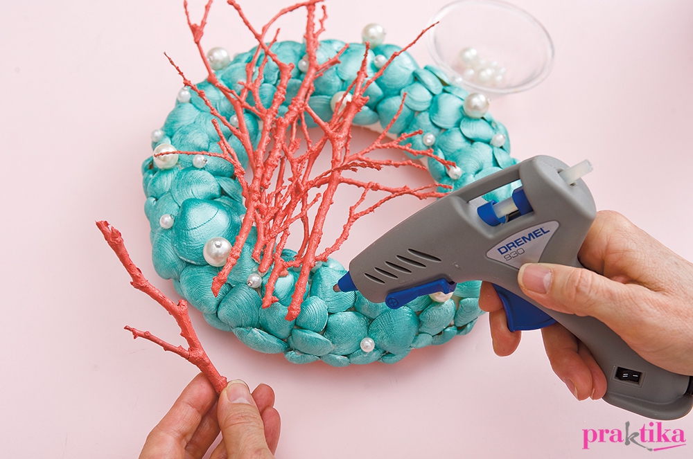 Fektesd asztalra a koszorút, és a látható részére ragaszd fel a kagylókat pikkelyszerű takarásban. Váltogasd a különböző méretű darabokat, hogy amennyire csak lehet, takard a koszorút. A kagylók közötti mélyedésekbe rögzíts melegragasztóval különböző méretű teklagyöngyöket. Próbáld a faágakat a koszorúra, majd vágd – szükség szerint – megfelelő méretűekre. Fesd le egyenként korallszínűre. Száradás után ezeket is melegragasztóval teheted a koszorúra. A hátoldalára gombostűvel szúrd a hungarocellbe a képakasztót.