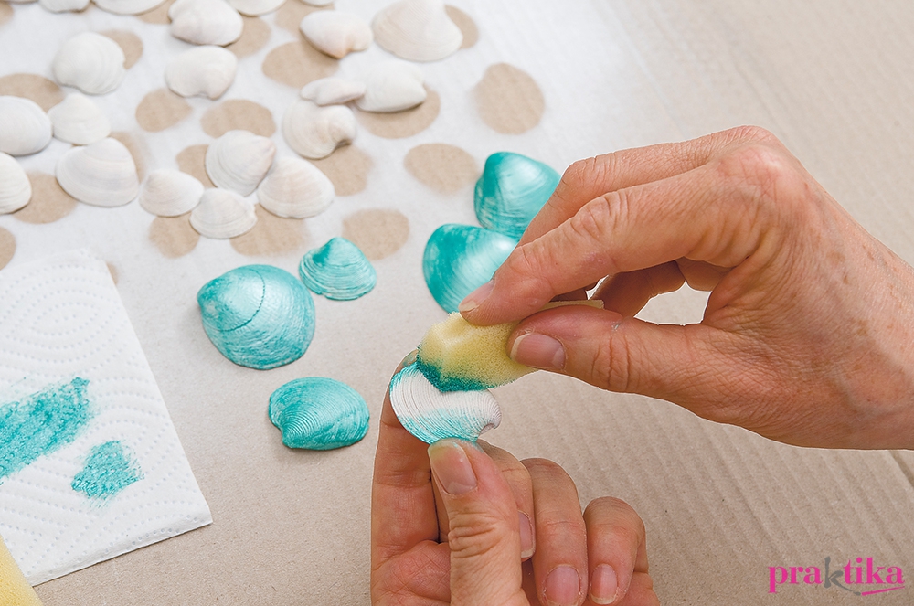 A tisztára mosott kagylóhéjakat csomagolópapíron vagy nagy papírdobozban terítsd szét, domború felükkel felfelé. A spray-vel fújd le fehérre. Hagyd megszáradni. A gyöngyházfényű akrillal fesd zöldre a héjakat – használj szivacsdarabot, hogy vékony rétegben tudj színezni. Ezt is hagyd megszáradni. A koszorút tekerd be a vászoncsíkkal – a kezdetet és a végét gombostűvel rögzítsd. Ez azért fontos, mert a vásznon jól megtapad majd a melegragasztó.