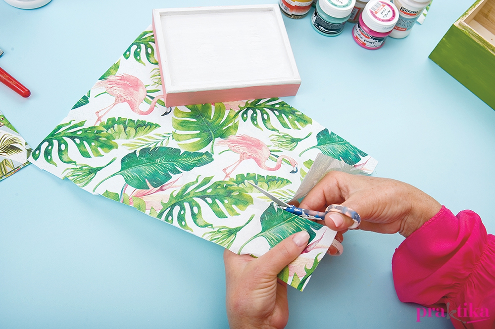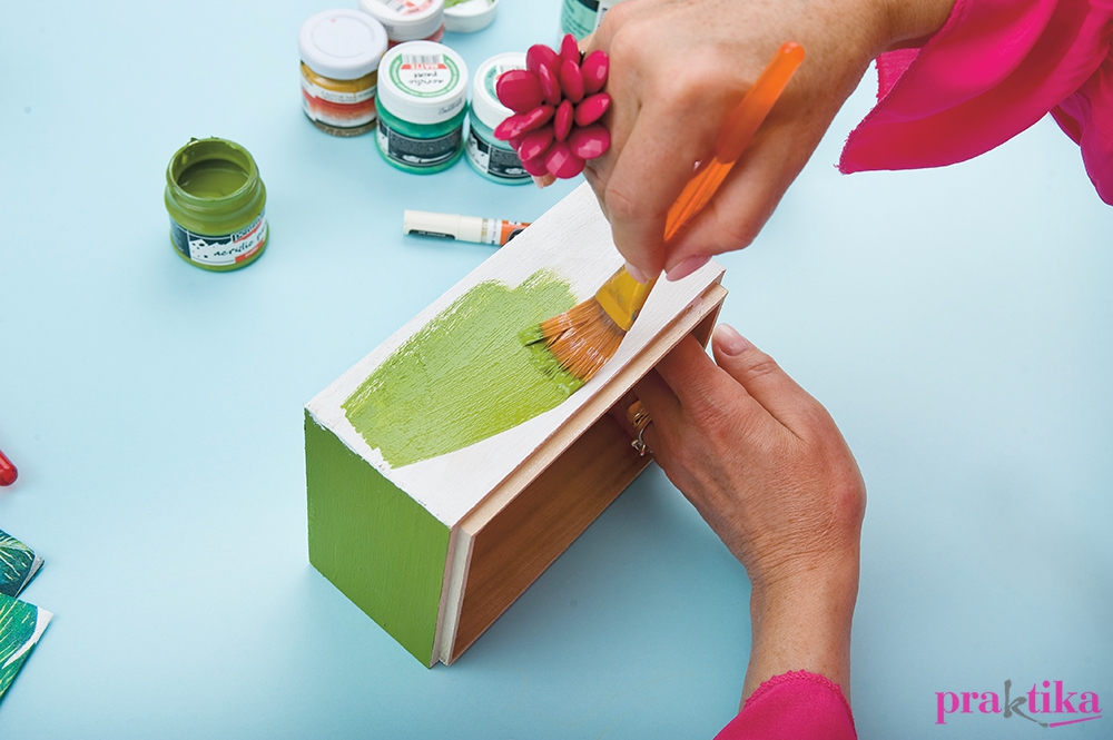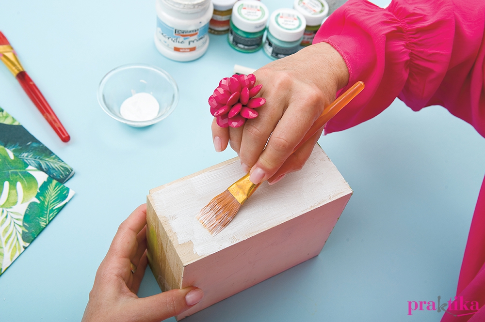 Hozzávalók • fadoboz • trópusi mintás szalvéta • 3D lakk • hobbilakk • fehér és színes akrilfestékek • dekupázsragasztó • ecset • fehér akrilfilctoll • indigó