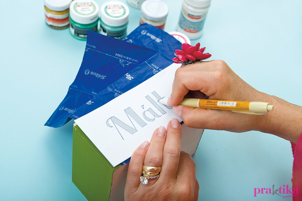 Szövegszerkesztőben tervezd meg a feliratot, nyomtasd ki, majd másold át a doboz oldalára indigó segítségével. Rajzold át a feliratot fehér akrilfilctollal. Ha fényes felületet szeretnél, a doboz oldalait is kend be hobbilakkal.