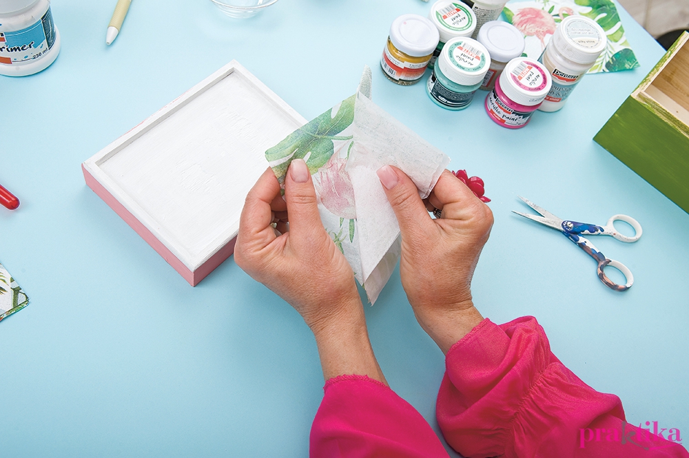 Alapozd le a dobozt és a tetőt is fehér festékkel. Száradás után a doboz oldalait fesd le a választott színnel, a tető oldalát pedig egy másikkal. Szabj a tető méreténél 2-2 mm-rel kisebb darabot a szalvétából, majd távolítsd el a hátsó, mintázatlan rétegeket.