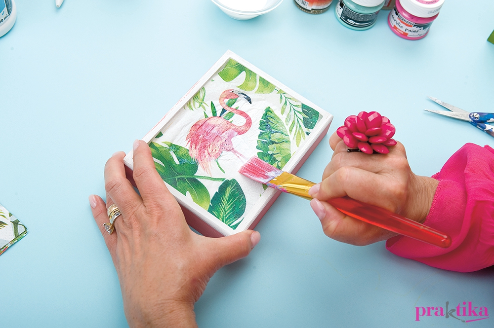 A dekupázsragasztót egy kis tálkában hígítsd fele-fele arányban vízzel. Helyezd a szalvétát a doboztető közepére, és középről kifelé haladva vidd fel rá ecsettel a hígított ragasztót, ami átitatja a vékony szalvétát. Lassú, finom mozdulatokkal haladj, hogy a szalvéta ne szakadjon el. Ha sokszor kell áthúznod egy felületet, akkor elszakadhat a leheletvékony papír. Száradás után a dekupázsolt mintát kend át 3D lakkal.