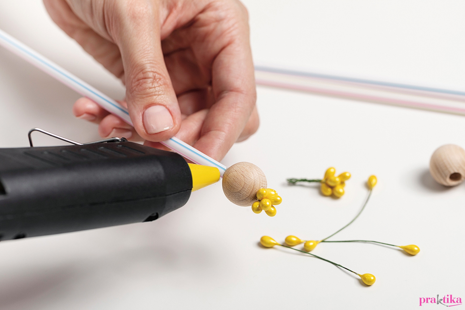 Tekerj össze 3 pár sárga virágbibét, majd melegragasztóval rögzítsd a fagolyóban. A lyuk másik oldalába ugyanígy ragassz szívószálat, ez lesz a virágod alapja. Sárga krepp-papírból vágj le 6x15 cm-es téglalapokat, az egyik hosszanti oldalát cikcakkollóval. A cikkcakkok mentén ollóval vagdosd be a papírt nagyjából 2,5 cm mélységig. A fagolyót kend be papírragasztóval, majd simogasd rá a sárga krepp-papírt úgy, hogy a bevágott részek alját benyomkodod a bibék alá. Vágd ki a szirmokat és a zöld leveleket.