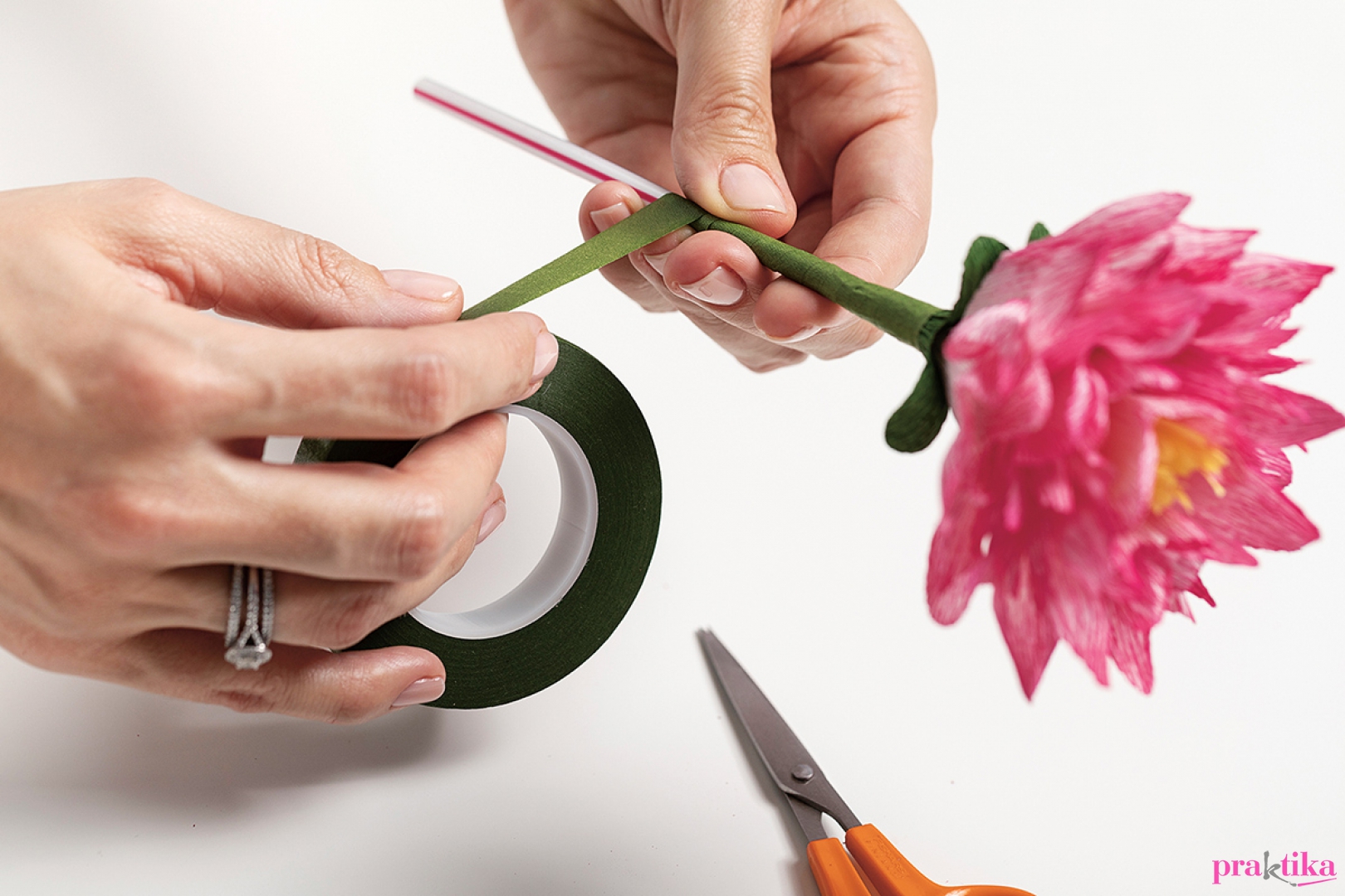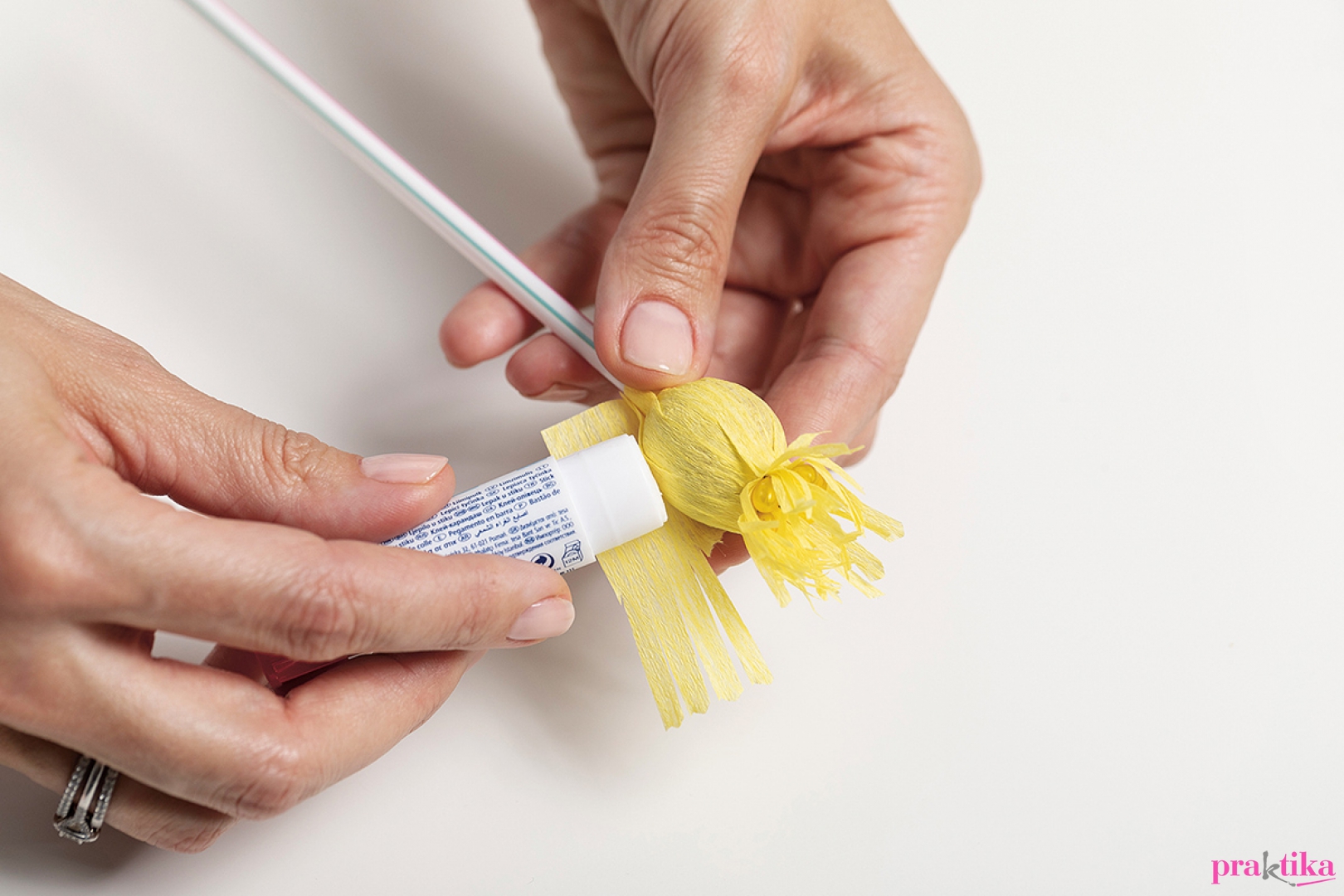 A szirmok alját papírragasztóval kend be, és egyesével kezdd el feltapasztani a sárga kreppel fedett golyós alapra. Használj legalább16 db szirmot. Az alját 3 db csészelevéllel zárd le, de ezeken előbb húzz végig egy vonalzót, hogy ívesek legyenek. Végül zöld kreppszalaggal tekerd végig a szívószálat. A szalag akkor válik öntapadóssá, ha kicsit széthúzod.