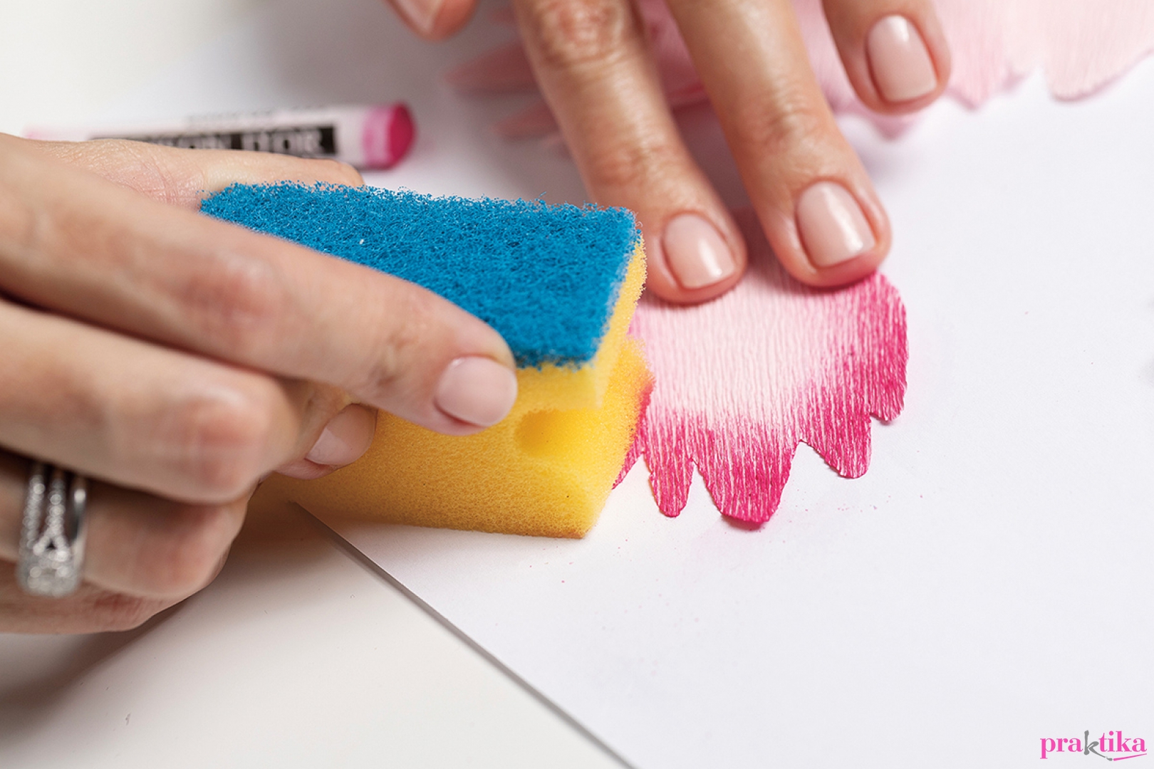 Egy virághoz 16 db sziromra és 3 db csészelevélre lesz szükséged. Ezeket nem kell egyenként kivágni, 5-6 réteg kreppet összefoghatsz, így gyorsabban haladhatsz. Ha világos a szirmod és színezni szeretnéd, akkor kenj pasztellkrétát egy vizes szivacsra, majd ezzel simítsd át a szirmok szélét. A szirmoknak adj öblös formát úgy, hogy a felső részüknél széthúzod a kreppet.
