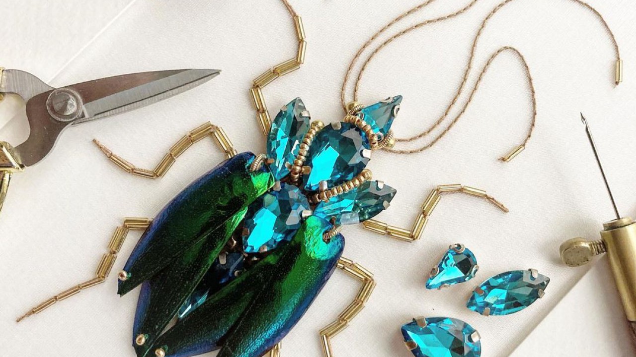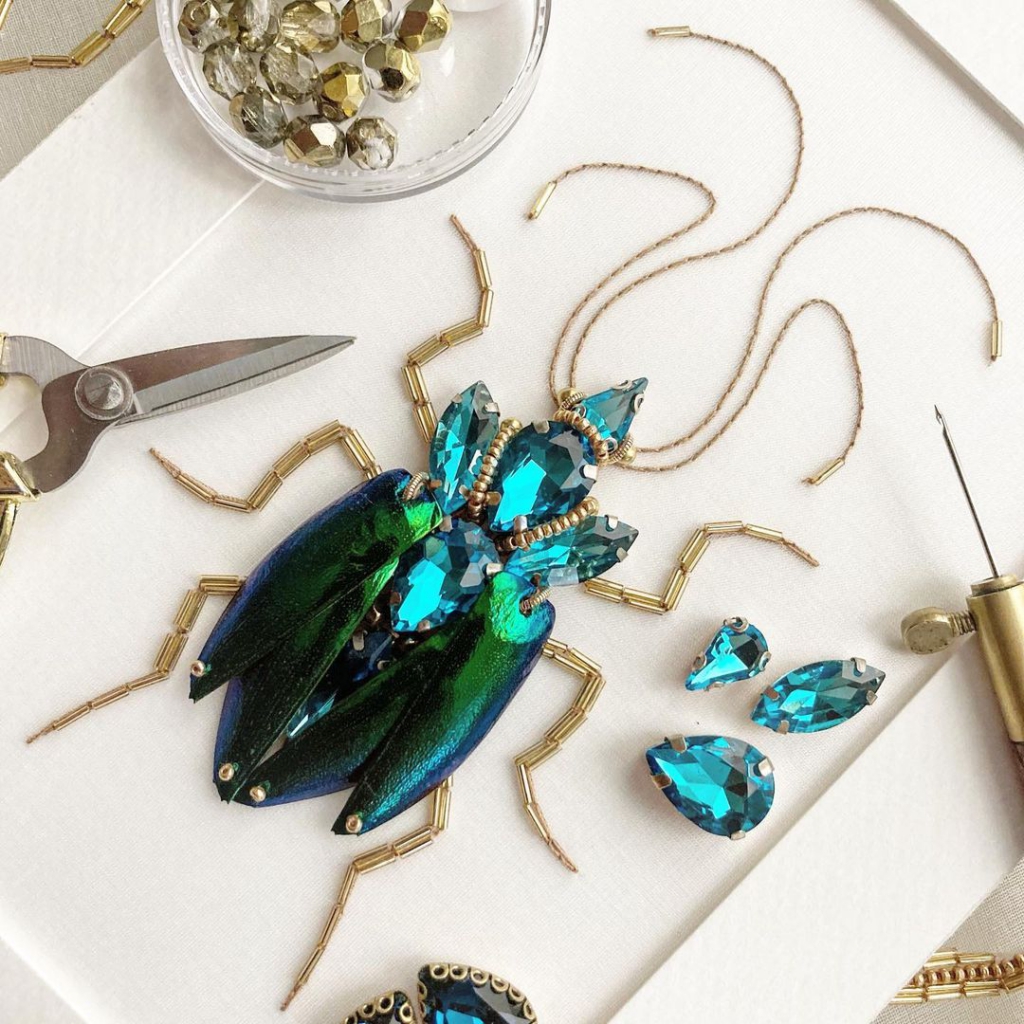 Káprázatosan szép bogaras képeket készít Noboru Hoareau. A francia művész az úgynevezett tambour hímzési technikával dolgozik speciális tűvel a kifeszített anyagon, a rovarok testéhez pedig gyöngyöket, kristályokat és egyéb színes köveket használ. Az alkotásokat később be is keretezi, így azt akár a falra is kitehetjük.