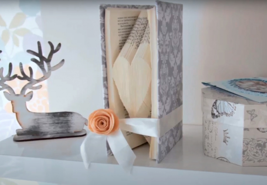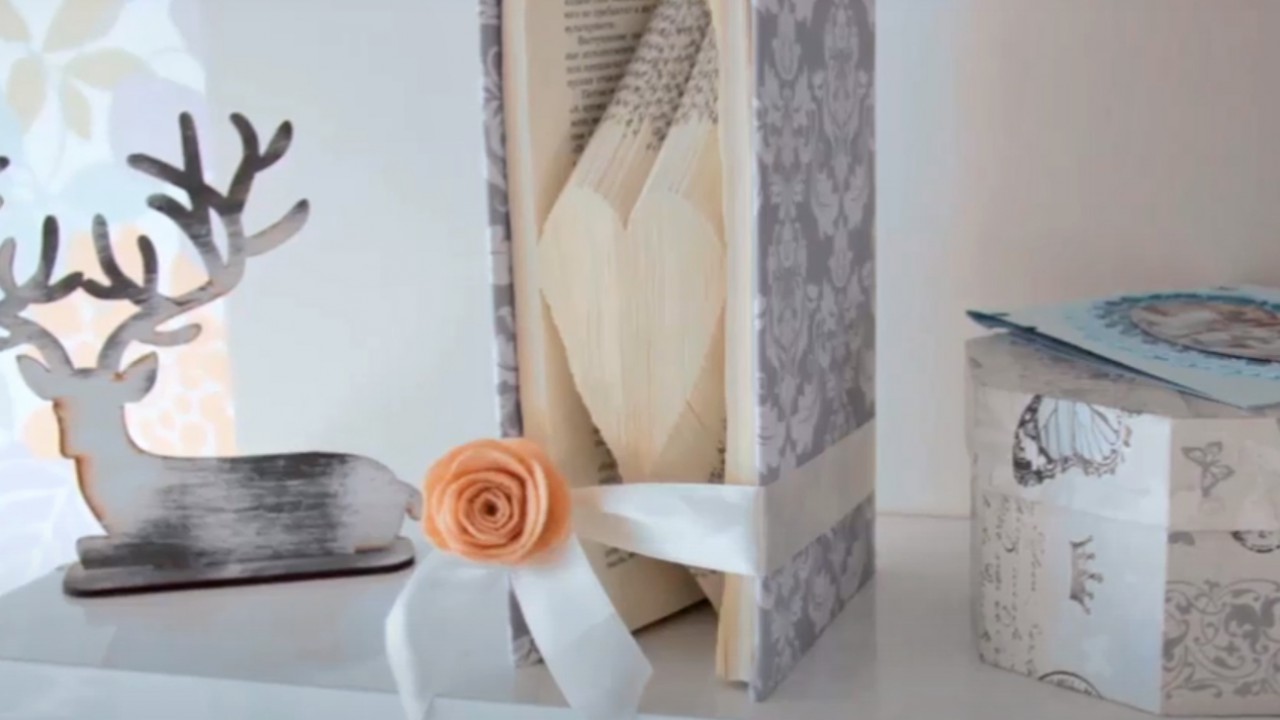 Már egy hónap sincs hátra a Valentin-napig, itt az ideje, hogy hozzáfogjunk a dekorációk elkésztéséhez! Ehhez a mutatós darabhoz alig néhány hozzávalóra lesz szükséged. Kezdd el behajtogatni a lapok széleit. Ehhez érdemes vonalzót használni, így fog szépen kirajzolódni a szívecske. Ha ez megvan, színes papírral vond be a könyv borítóját. Végül egy szalaggal kösd át az egészet és ragassz rá egy kis virágot.