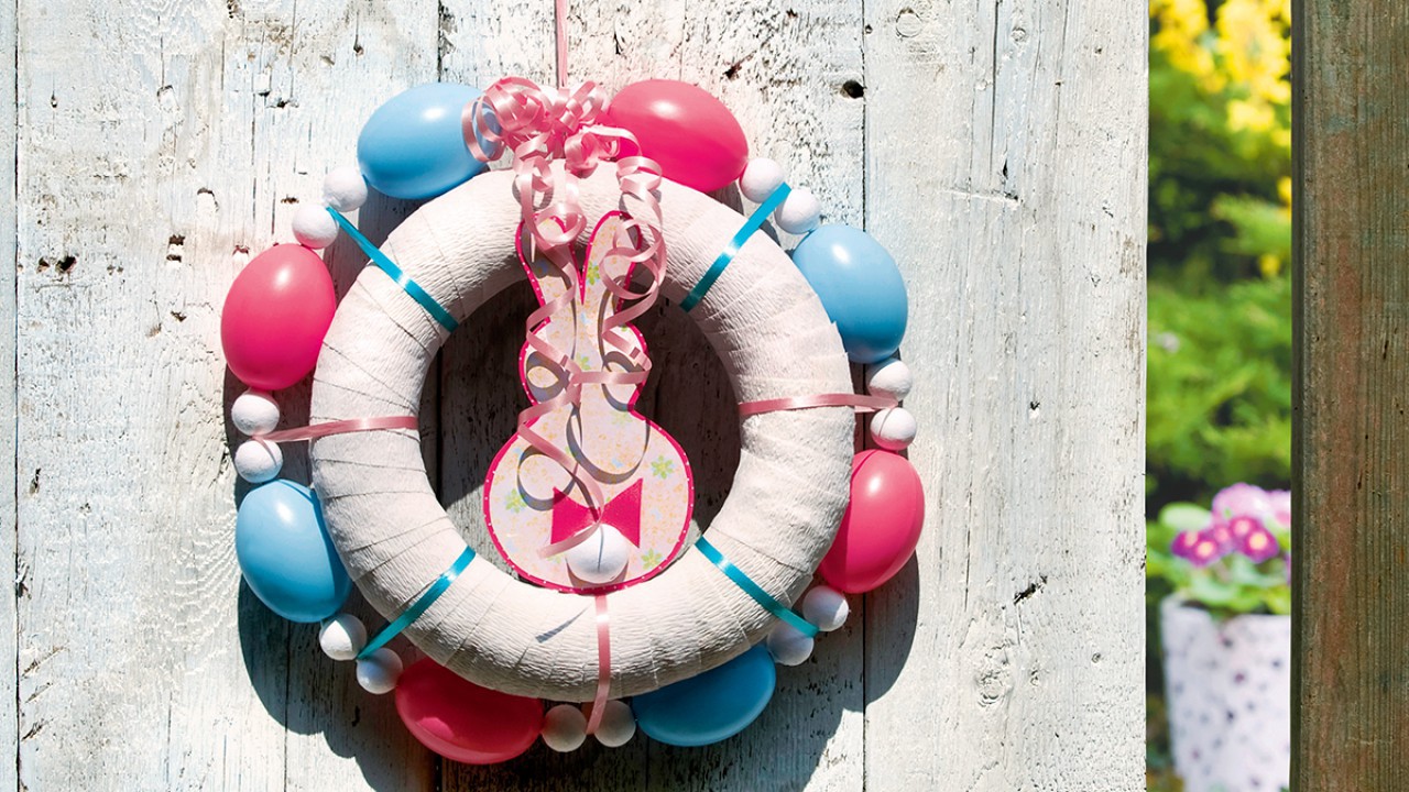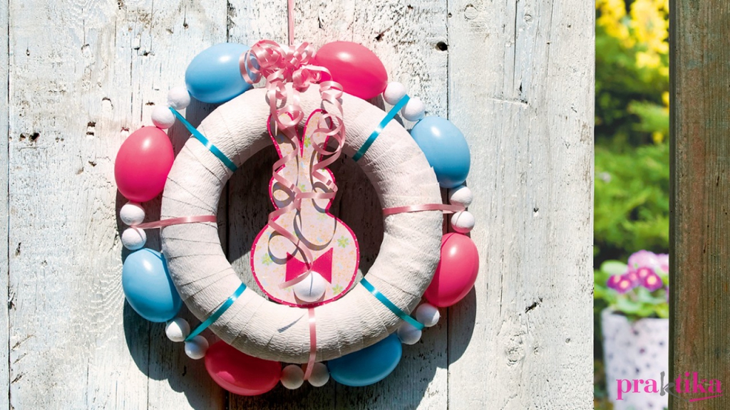 Dekorálj tojásokkal és nyuszival, hogy húsvéti hangulatba kerülj! Ennek a koszorúnak az alapja hungarocell, erre kell rögzítened a színes elemeket. Ha kíváncsi vagy az elkészítés folyamatára, kattints ide!