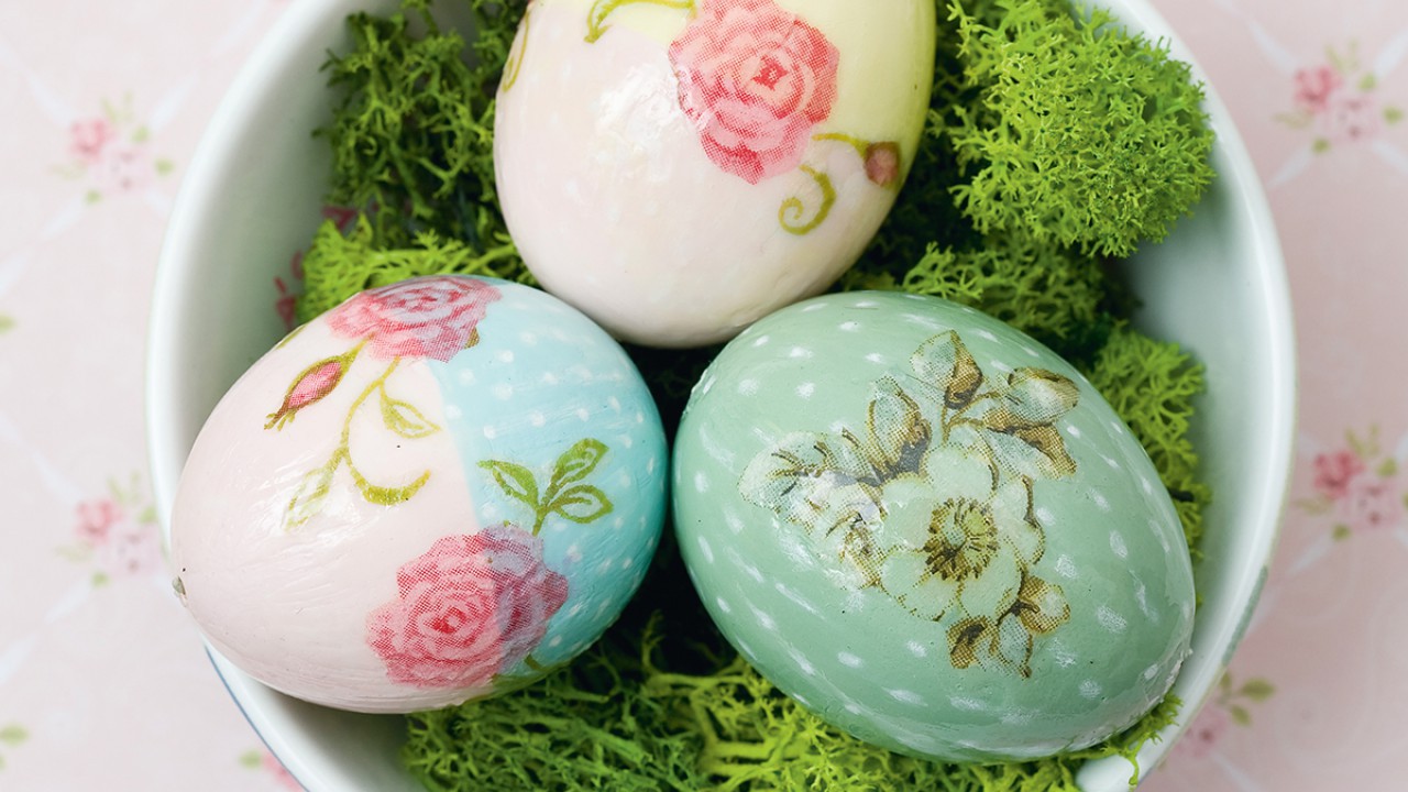 Transzferálással villámgyorsan lehet tojásokat is díszíteni. Fesd le világos akrillal a tojásokat, és a kiválasztott, megfelelő méretű minták tükörképét nyomtasd ki. Miután kivágtad a motívumot, a tojásra fordíthatod, és ha ragasztószalaggal rögzítetted, transzferáló folyadékba mártott fültisztító pálcával itasd át a papírt. Kattints ide és töltsd le a mintákat hozzá!