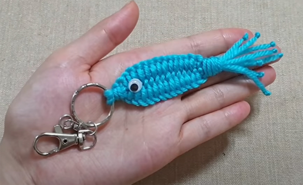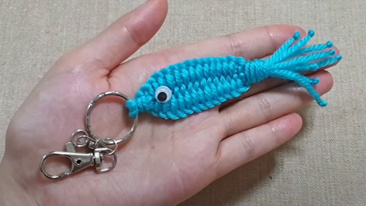 A halacska elkészítéséhez kulcstartó-karikára és kék fonalra lesz szükséged. Utóbbi színe természetesen tetszőleges, bármilyent választhatsz. Három hosszú fonalat húzz át a karikán. Alattuk, keresztben vezess el egy negyedik szálat, ezzel kell majd dolgoznod. Kezdd el a csomózást a videón látható módon! A karikát szigszalaggal rögzítheted is, hogy ne mozduljon el. A végét tekerd meg szorosan, hogy ne bomoljon szét használat közben. Vágd le a hátsó uszonyát és köss rá csomókat. Végül ragassz rá szemecskét.