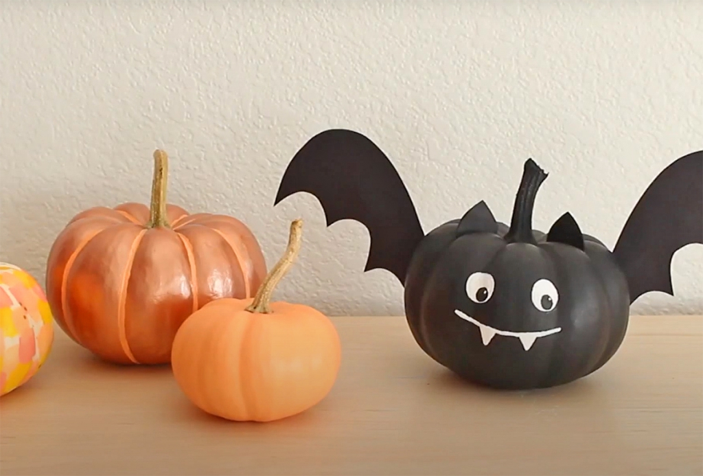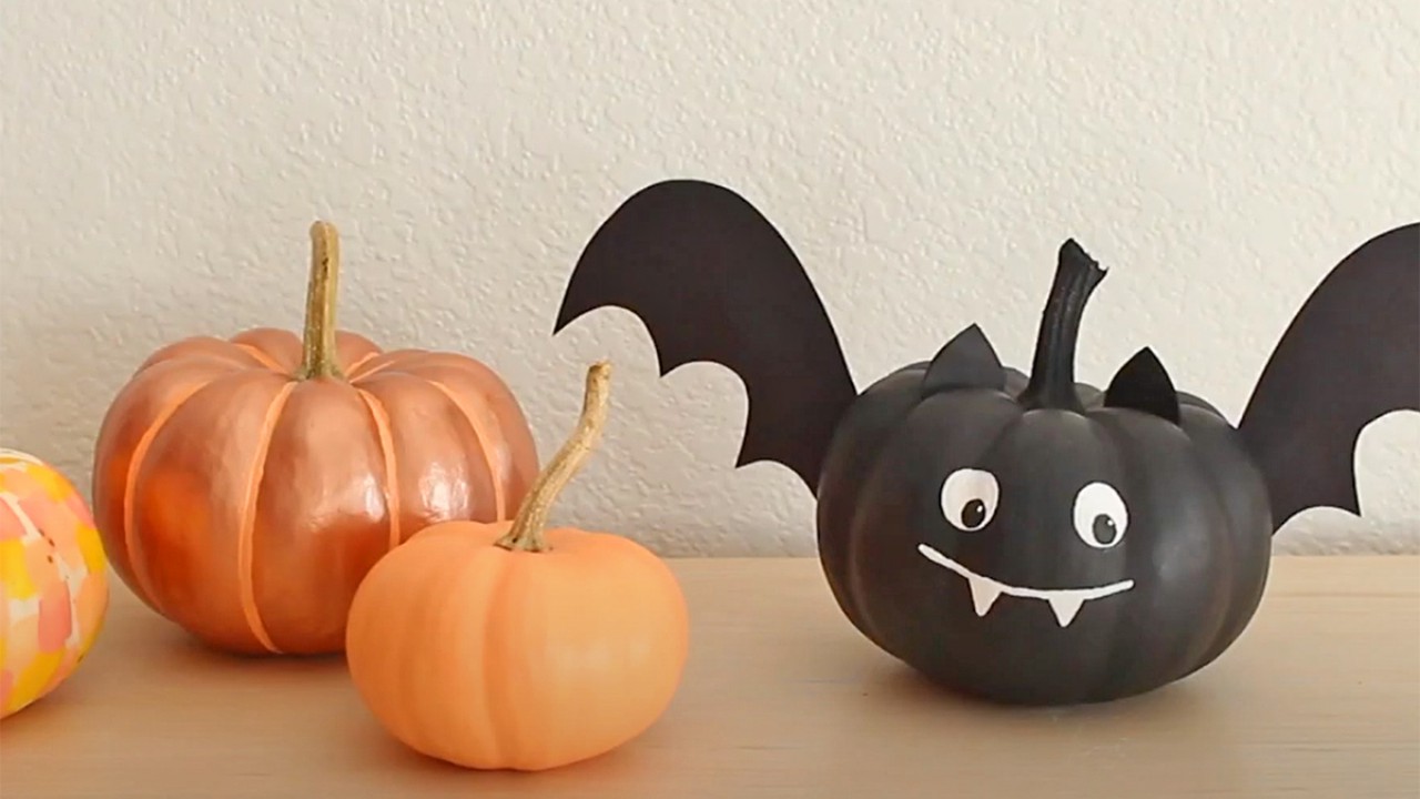A bájos denevérhez fekete papírból vágj ki két-két szárnyat és fülecskét, tedd egymásra őket és ragaszd össze úgy, hogy közéjük egy-egy fogvájót teszel. Fesd le feketére a tököt, majd ha megszáradt, szúrd bele a szárnyakat, füleket. Ezután jöhet az arca: fehér festékkel fesd rá a szemeket és a szájat.