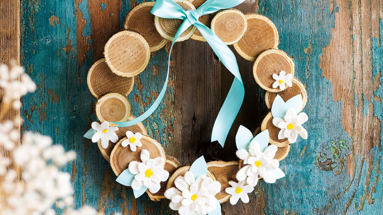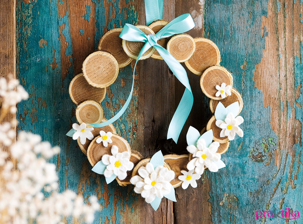 Hozzávalók • 20 cm átmérőjű fakarika • 5-7 cm-es faszeletek • fehér filc • sárga kásagyöngy • világoszöld műbőr • szaténszalag • melegragasztó • tű, olló, cérna