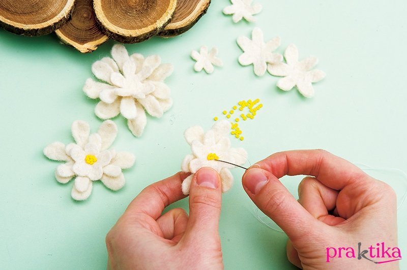 2. Vágj a filcből kisebb-nagyobb virágokat, és öltögess 2-3 darabot egymásra. A virág közepét varrd ki sárga gyöngyökkel.