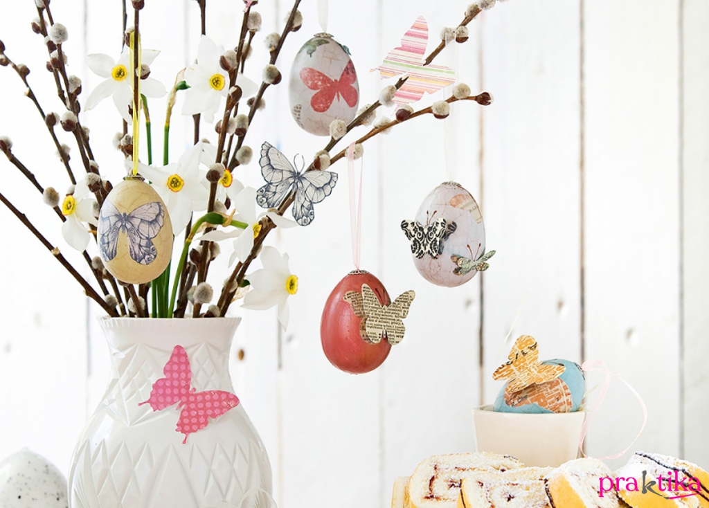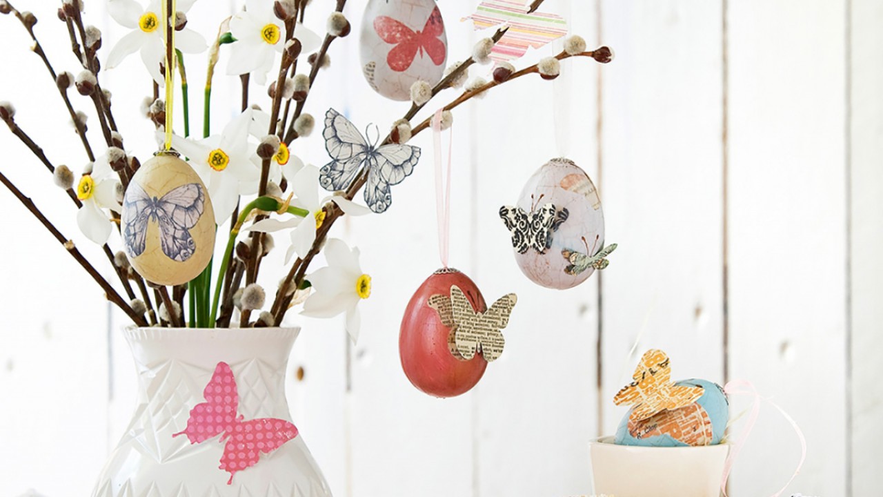 Dekorálj pasztellszínű pillangókkal és antikolt tojásokkal! Előbbieket készítheted barokkos mintázatú papírokból, de újságlapokból is. Kattints ide a részletekért!
