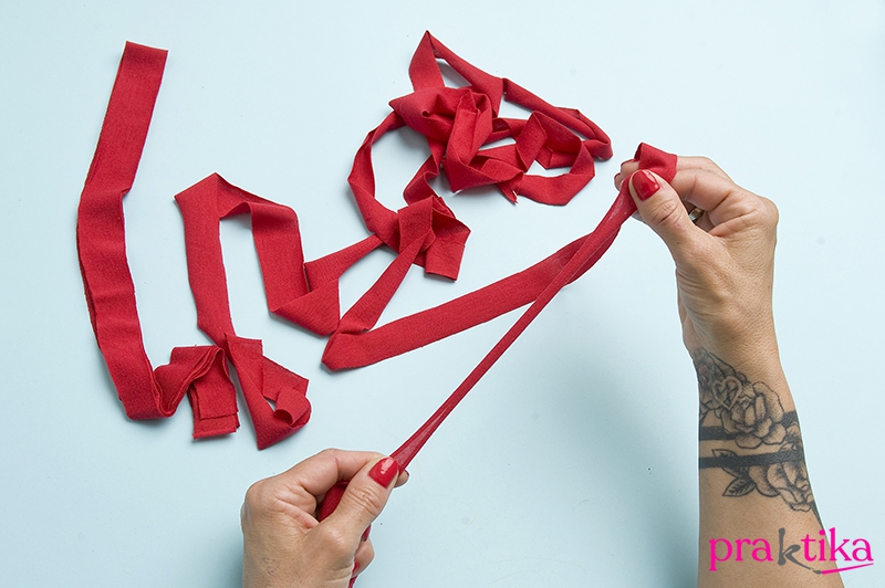 1. Ha pólófonalakkal dolgozol, vágj színenként 2-2 db 3 m-es csíkot. Ha te készíted a fonalat, 2 cm széles sávokat szabj az anyagból, a szálirányra merőlegesen. Amennyiben a csíkok nem adják ki egyben a 3 m-t, varrd össze a darabokat úgy, hogy 45 fokban levágod a végüket, derékszögben egymásra teszed és átlósan összetűzöd. Varrd össze kézzel vagy géppel, és vágd keskenyre a varrásszélességet.