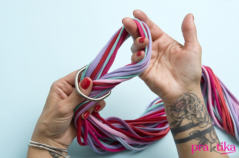 2. A szabott csíkokat húzd meg hosszában, hogy a szélük bepöndörödjön. Ezáltal válik fonalszerűvé az anyagcsík. Fogd össze a szálakat – nem baj, ha a végeiket nem illeszted pontosan. Hajtsd félbe a köteget és hurkold bele a D-karikába.