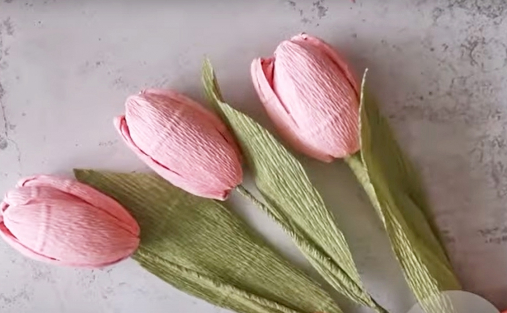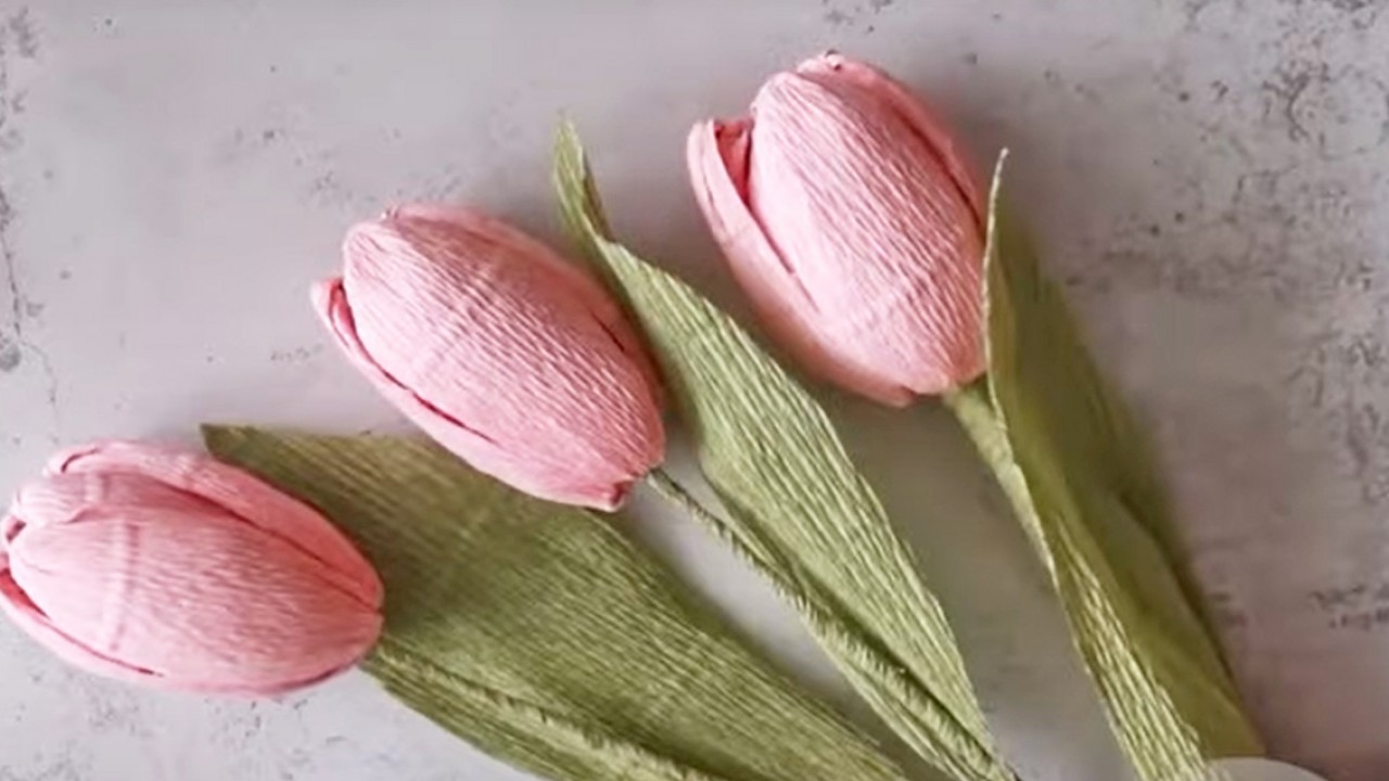 Ezeket a csodás papírtulipánokat egyszerűbb elkészíteni, mint gondolnád! A virágokhoz rózsaszín krepp-papírt használj, vágj le belőle három-három 15 cm és 17 cm hosszú darabot. Formáld meg az ujjaiddal a szirmokat a videón látható módon. Alufóliából gyűrj össze egy kis gömböt és szúrd egy drótra. Eköré ragaszd fel a szirmokat. Zöld kreppel tekerd be a drótot és készítsd el a leveleit.