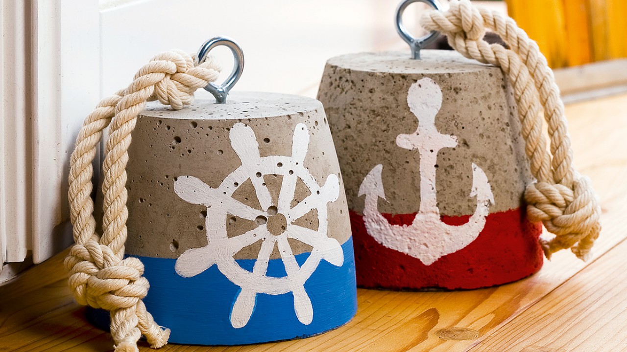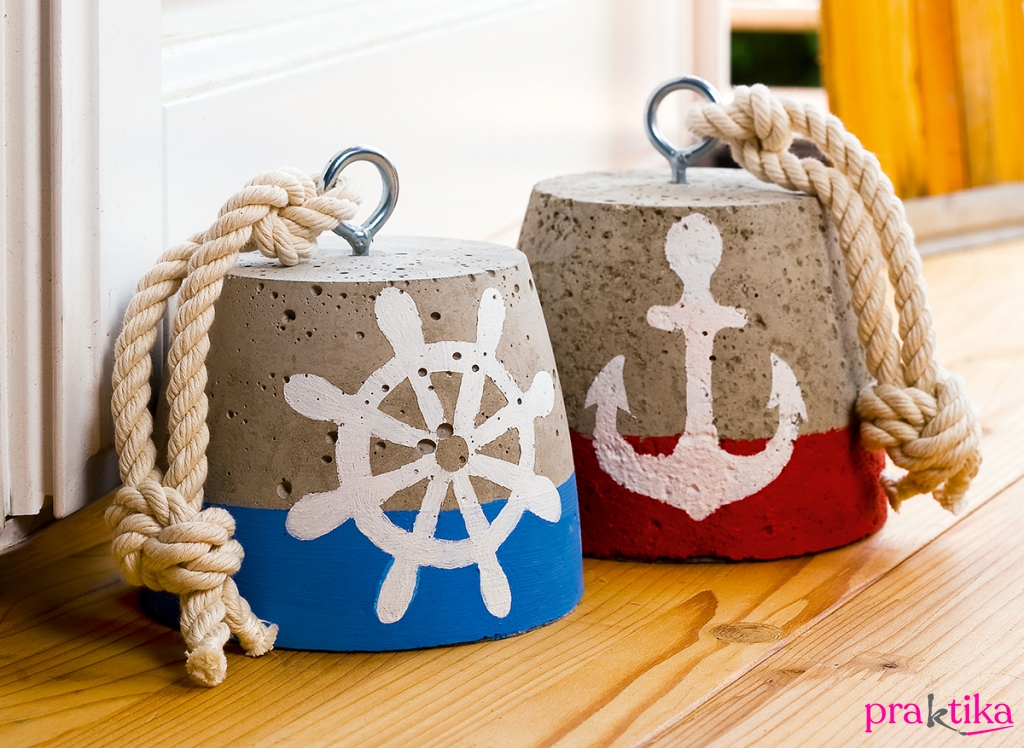 Hozzávalók két ajtótámaszhoz • szárazbeton, 5 kg • műanyag kaspó, 12 cm magas, Ø fent 13 cm, Ø lent 9,5 cm • 2 db szemescsavar, Ø 28 mm • 120 cm sodrott pamutkötél, Ø 0,8 cm • 14 cm farúd, Ø 18 mm • akrilfesték, fehér, piros, tengerkék • öntapadó fólia, 30×15 cm • filcanyag, 30×15 cm • fúrógép és fúrószár • indigó, maszkolószalag, olaj, gyurma • olló, ecset, szivacsdarab, keverőtál, kanál, üres konzervdoboz, melegragasztó