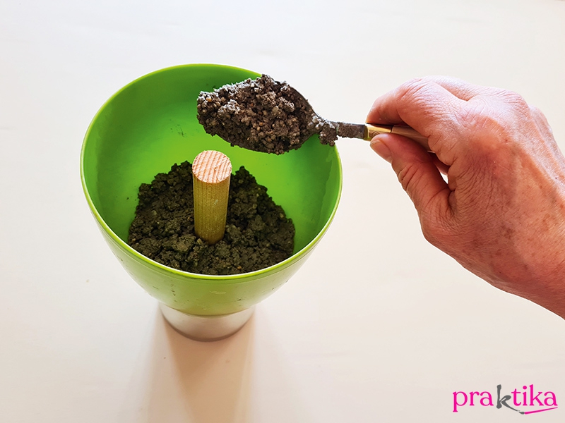 2. Ecsettel olajozd be belül a kaspót, hogy könnyen ki tudd majd venni a megkötött betont a formából. A használati utasítás szerint a szárazbeton felét keverd össze vízzel. Állítsd a kaspót az üres konzervdobozra, hogy elférjen benne a szemescsavar, és kanalazd a kaspóba a masszát. Fogd a kaspót, és finoman ütögesd a konzervdobozhoz, hogy a betonban lévő légbuborékok felszálljanak és kikerüljenek.