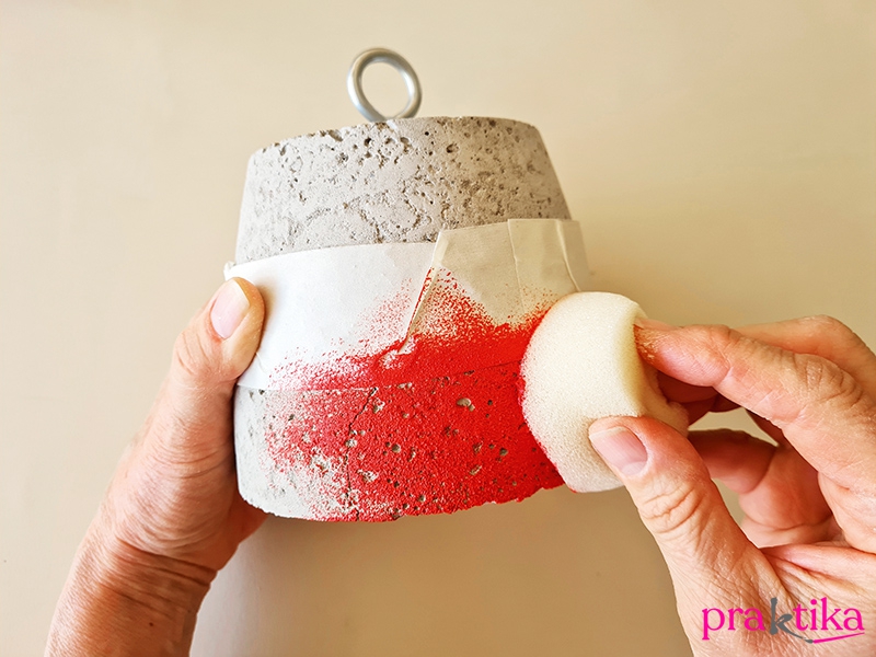 3. Pihentesd egy éjszakán át a kiöntött betont. Csavard ki a szemescsavart, fordítsd a kaspót lefelé, és óvatosan emeld ki az ajtótámaszt a formából. Hajtsd vissza a csavart. A maszkolószalagot ragaszd körben a betonra, az aljától 3,5 cm-re. Ezt az alsó, szabad sávot fesd be pirosra – szivaccsal nyomkodd rá a színt. Húzd le a szalagot és hagyd megszáradni a csíkot.