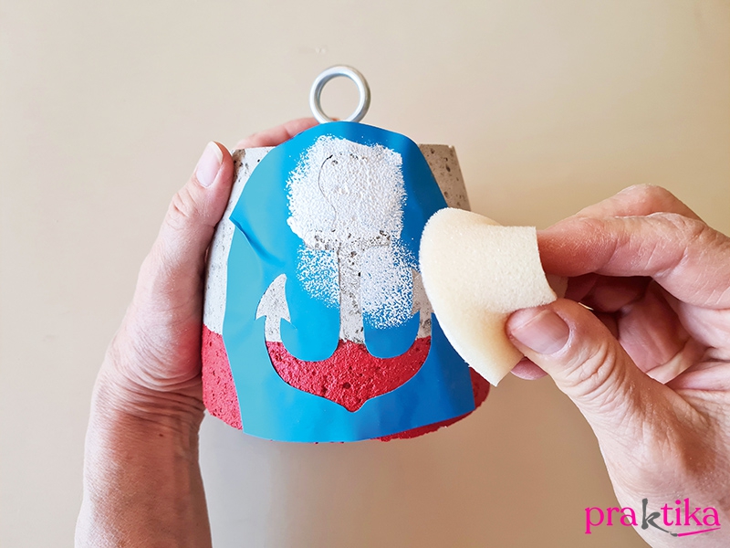 4. Vágd ketté az öntapadó fóliát két 15×15 cm-es négyzetre. Rajzolj az egyiknek a védőpapírjára horgonyt. Vágd ki belőle a horgonyt, a körülötte levő (negatív) mintáról húzd le a papírt és tapaszd a fóliát az ajtótámasz oldalára. Fehér akrillal, szivaccsal fesd ki a horgonyt. Húzd le a fóliát és hagyd megszáradni a festéket.