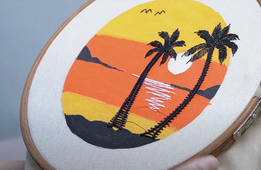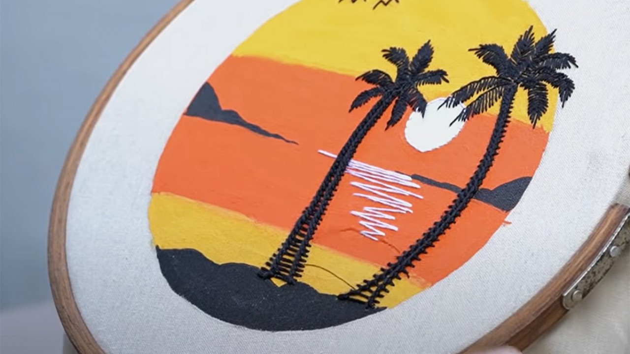 A kifeszített vászonra először rajzold meg a kép körvonalait, ezután jöhet a festés. Citromsárga textilfestékkel fesd meg a kép alsó és felső részét. A nap legyen fehér, a középső sáv pedig narancssárga. Ha megszáradt, fesd meg feketével a part vonalait. Folytasd a hímzéssel: fehérrel a nap körvonalát és a tükröződését a vízben. Ezután jöhet a legkreatívabb része, fekete cérnával hímezd meg a pálmafákat.