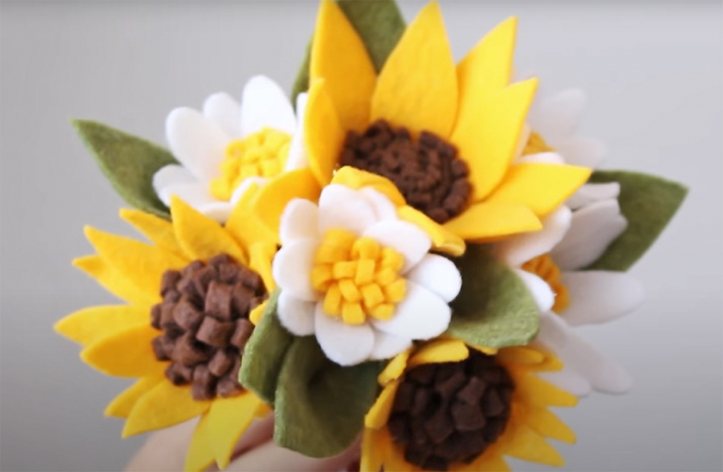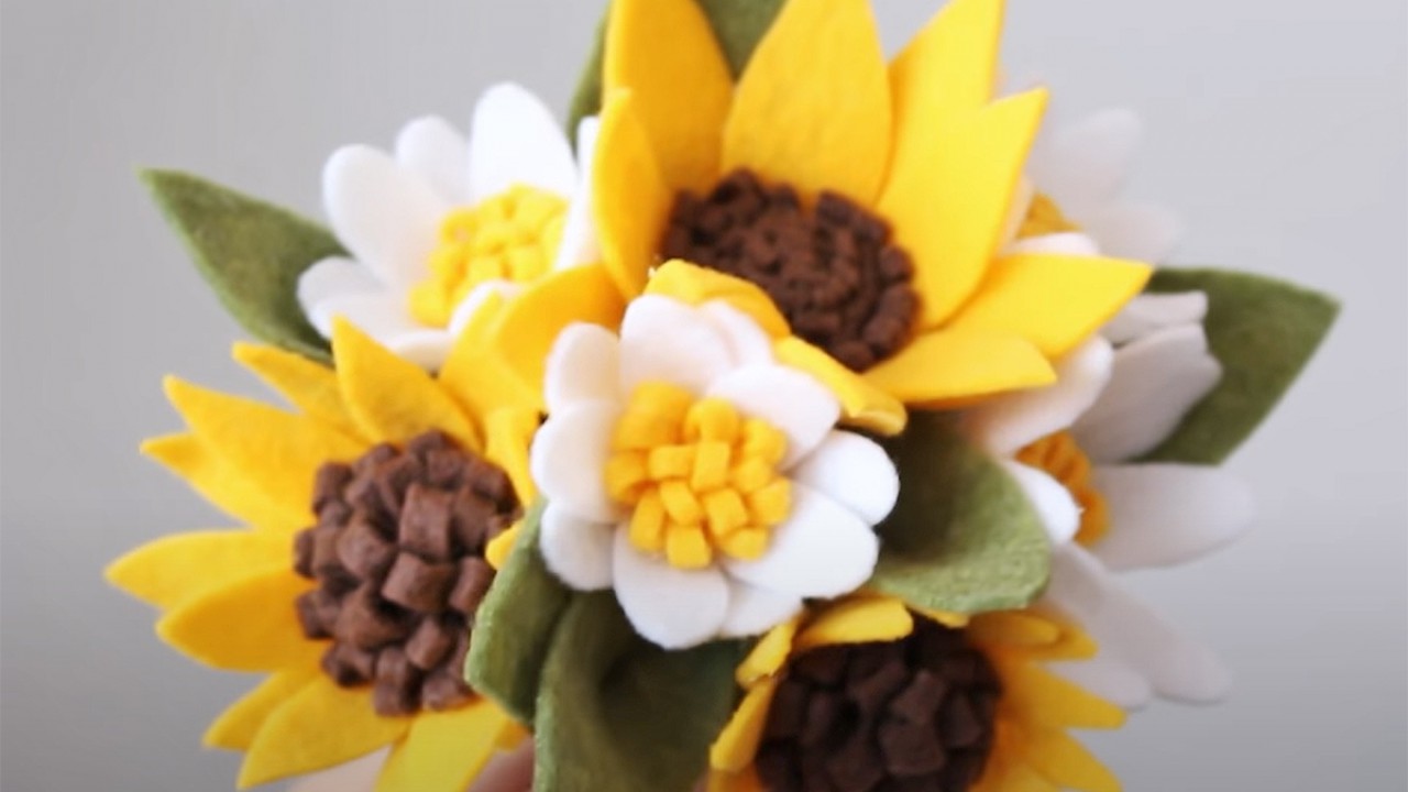 Ez a csokor napraforgóból és százszorszépből áll. Igazán vidám kombinációt alkot együtt a sárga, a fehér, a barna és a zöld. Első ránézésre bonyolultnak tűnhet az elkészítésük, pedig egyáltalán nem az. A szirmokhoz egyszerű kis téglalap formákat kell levágnod a filc anyagból, ezeknek kerekítsd le a tetejét és már kész is vannak. Nem kell tökéletességre törekedni, hiszen a valóságban sem teljesen egyformák.