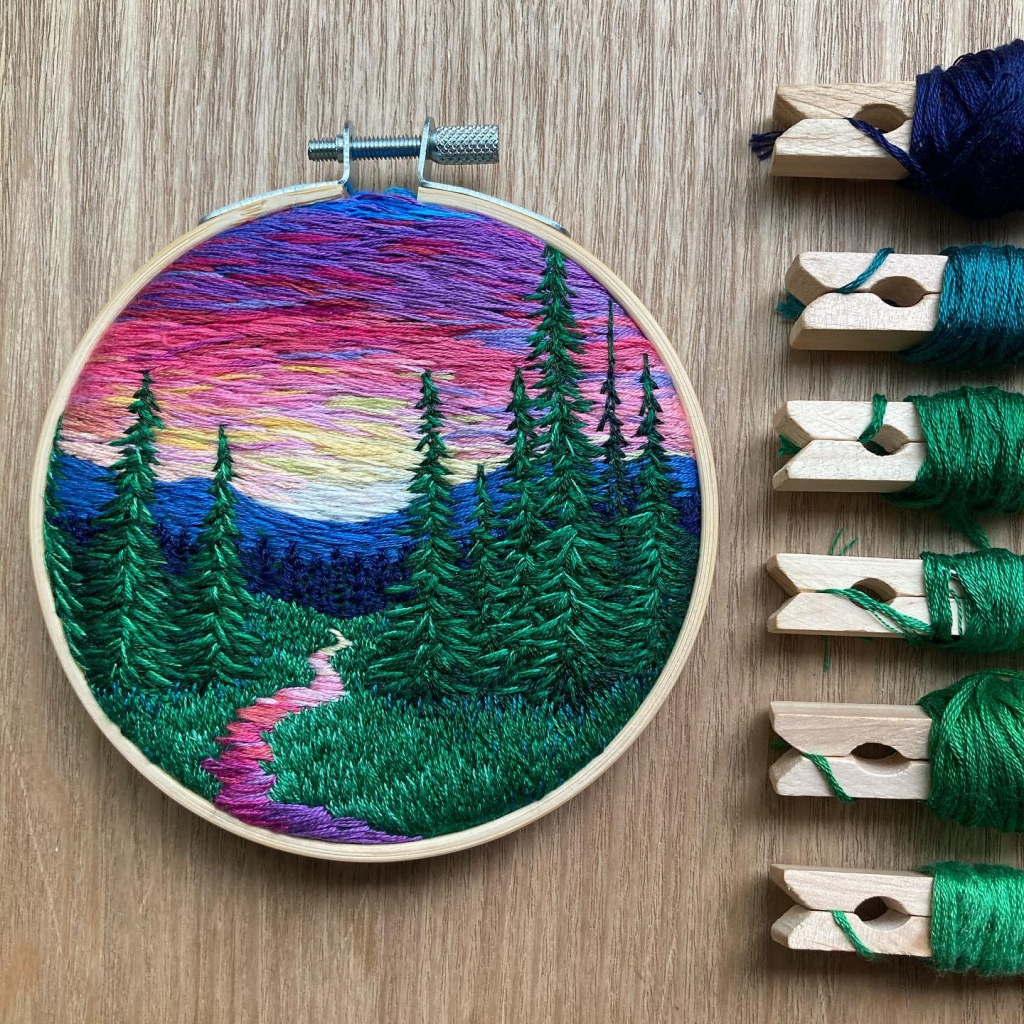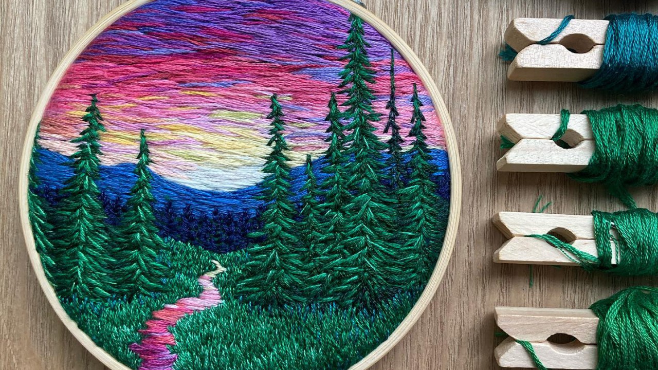 Az amerikai alkotó kedvenc témái a hegyek, völgyek, de olykor a közelgő vihar is megihleti. Fantasztikus, ahogyan a hímzőfonalakkal kidolgozza a különböző árnyalatokat, színátmeneteket, felhőket, lombokat, virágokat.