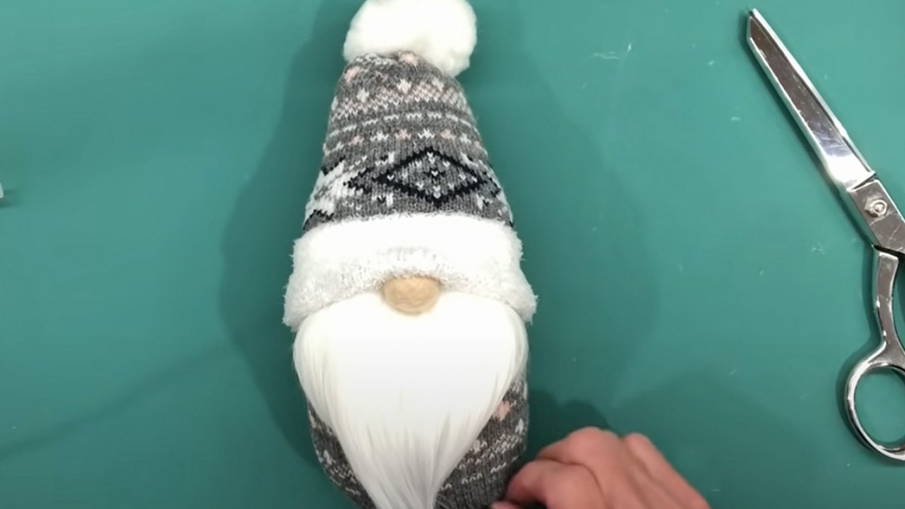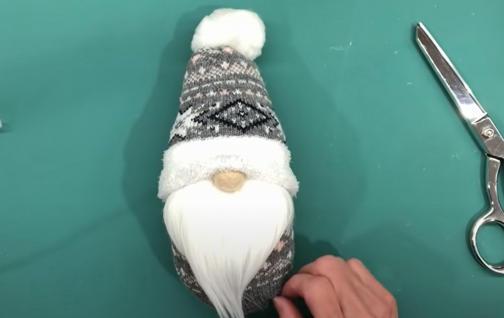 A vastag zoknit vágd ketté, az alsó részéből lesz a manó teste, a felső részéből a sapkája. Az alsó részt töltsd meg tömőanyaggal és a fent kösd össze. Fordítsd ki a felső részt és egy darab madzaggal kösd össze a végét. Ezután fordítsd vissza és egy vattapamacsot ragassz a csúcsára. Műszőrméből vágd ki a szakállát és ragaszd a testre. Illeszd rá a sapkát és egy fagolyót ragassz a testre – ez lesz az orra.
