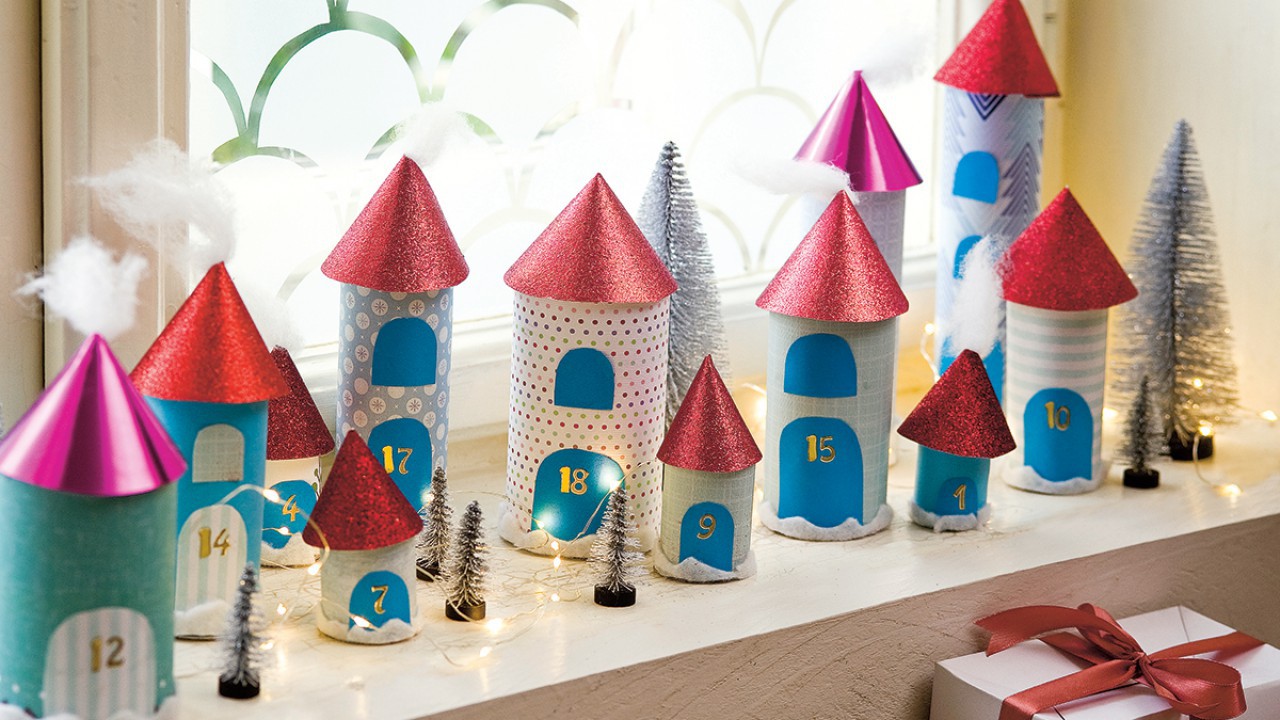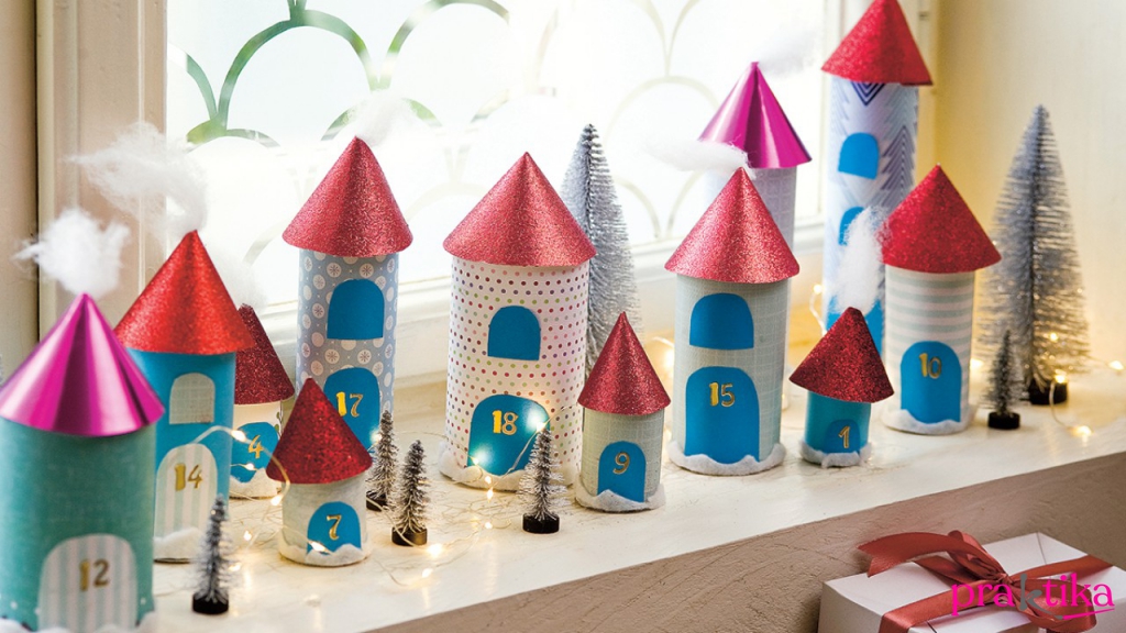 Adventi naptár papírhengerekből: téli város az ablakpárkányban