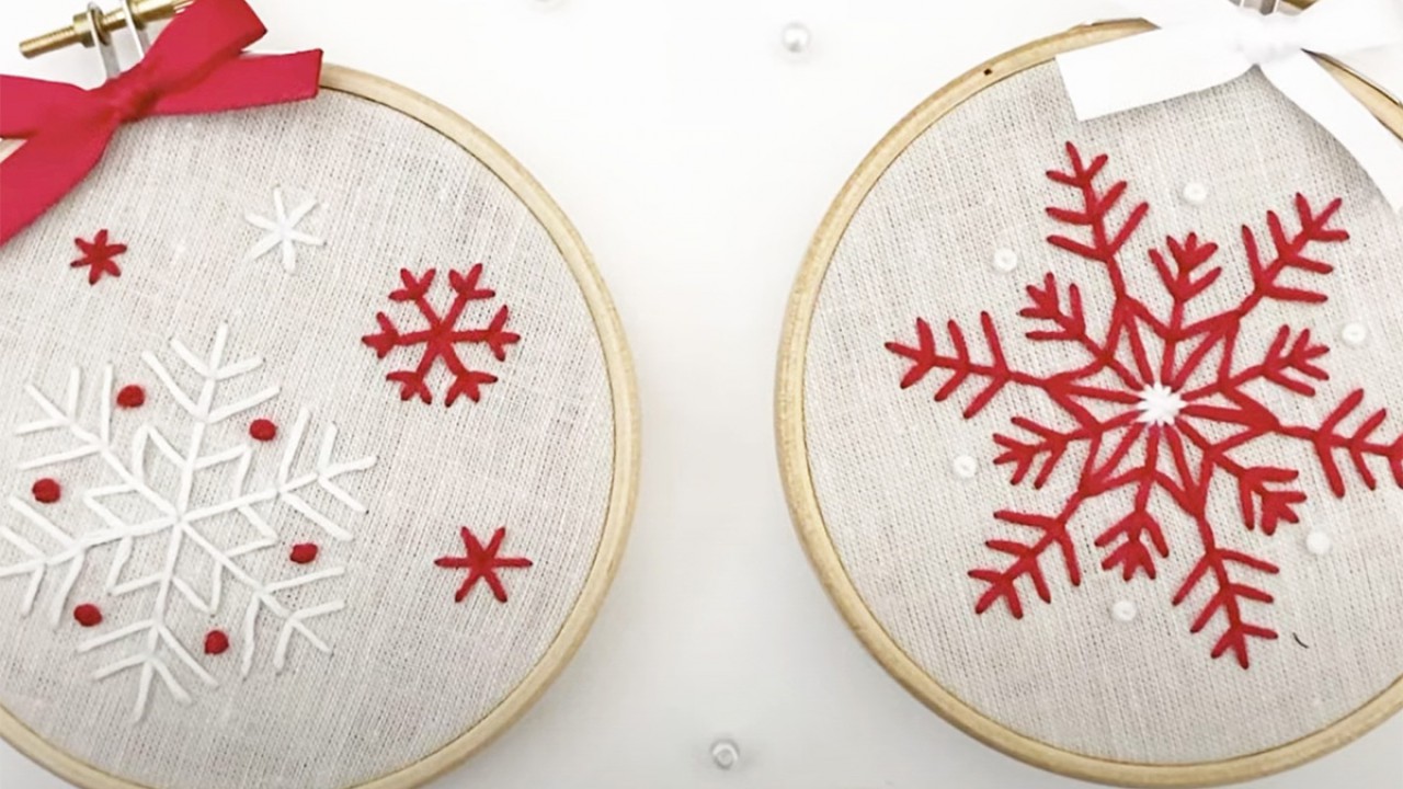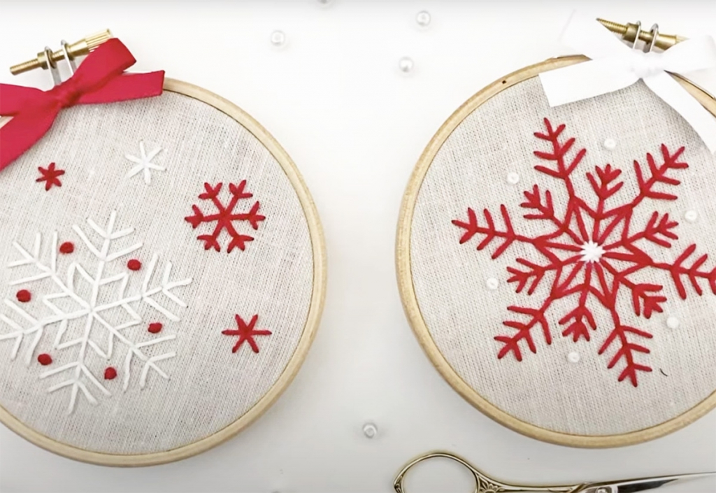A vászonra ceruzával rajzold meg a mintát. A sablont hozzá ide kattintva éred el (10 centiméter átmérőjű kerethez ideális). Az anyagot feszítsd ki a keretbe és jöhet a hímzés! Fehér és piros hímzőfonalra lesz hozzá szükséged: kövesd a videón átható lépéseket! Ha elkészültél a hímzéssel, fentre ragaszthatsz még egy-egy piros masnit is. Kiakaszthatod a faladra, de akár ajándékba is adhatod szeretteidnek karácsonyra.