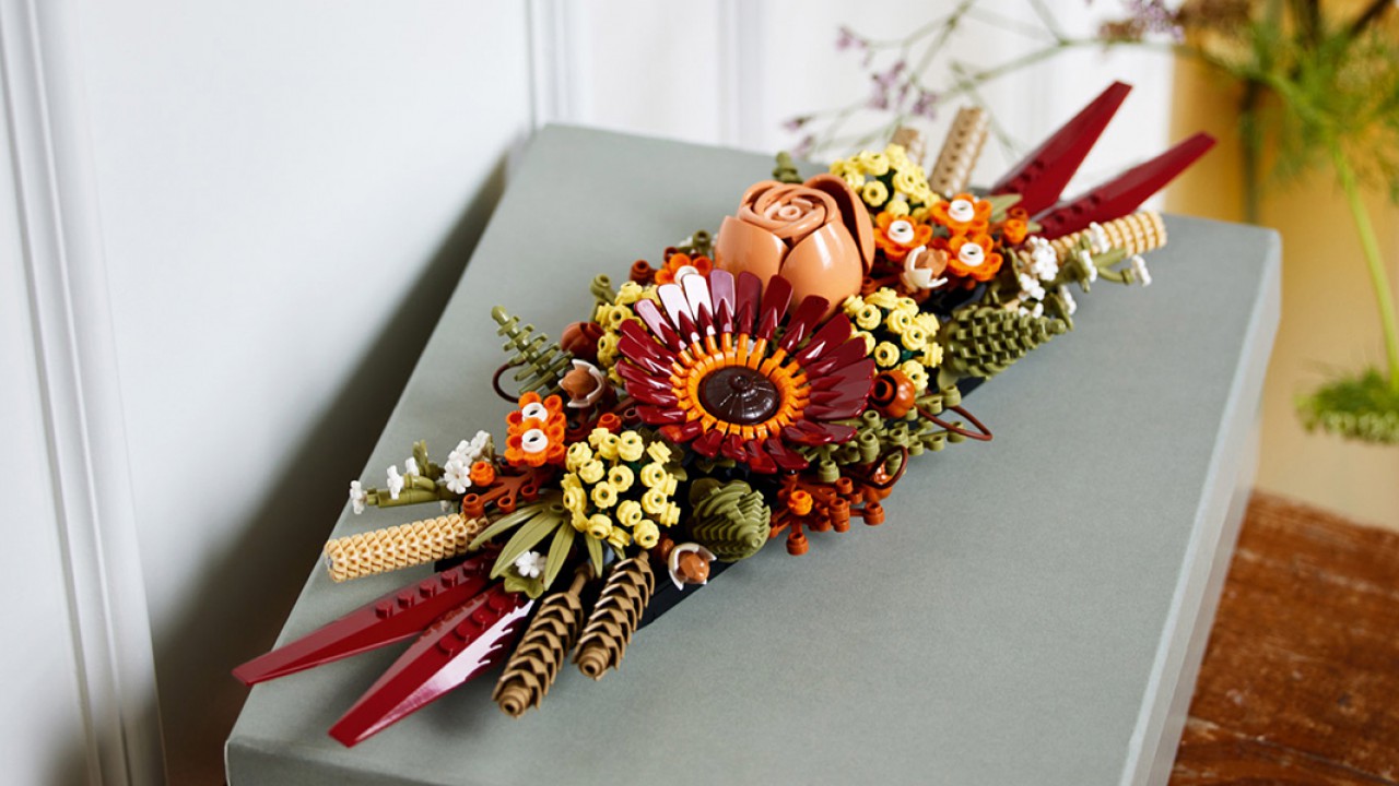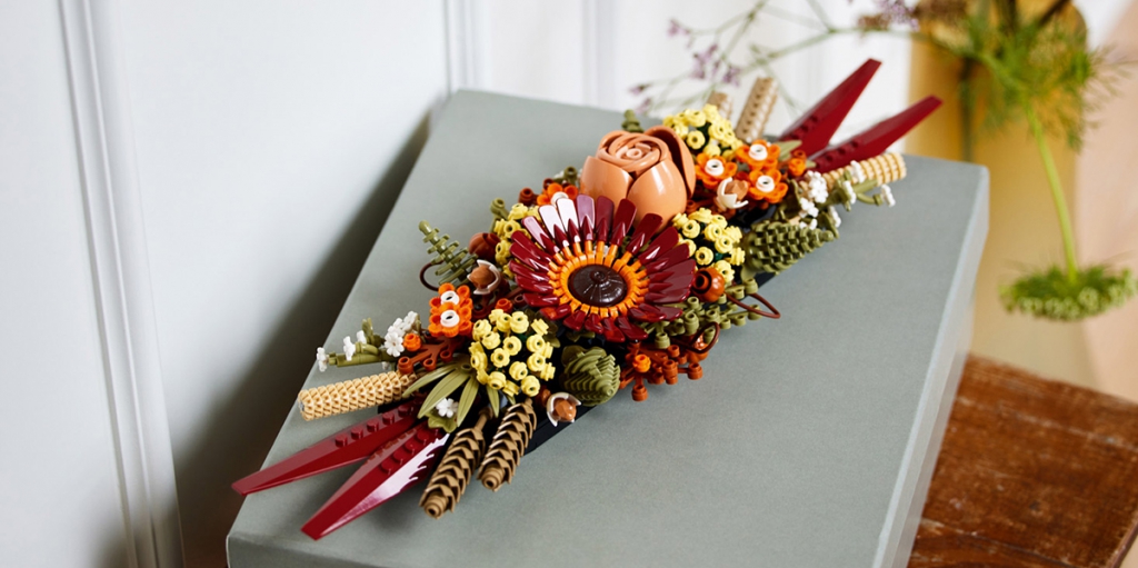 Az építők a LEGO® Szárazvirág-dekorációval olyan lakberendezési tárgyat alkothatnak, amely nem igényel gondozást. A készlet az ősz finom, nyugodt, tompa tónusaira emlékeztet gerberával és rózsával a közepén.