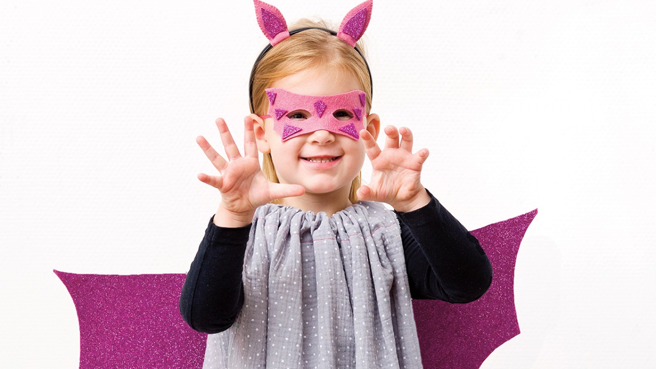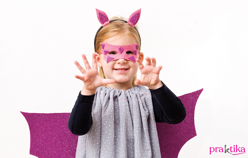 4. Vágd ki a maszkot, és díszítsd fel azt is dekorgumidarabokkal. Két szélére varrj szalagot, amivel majd meg tudod kötözni a gyerkőc fején az álarcot.
