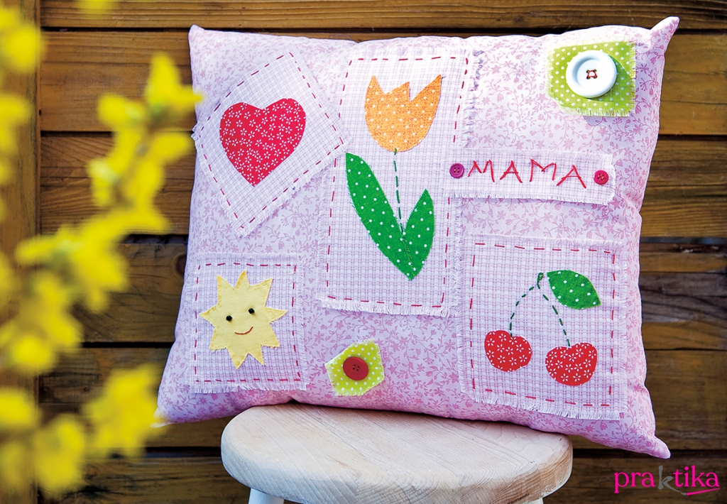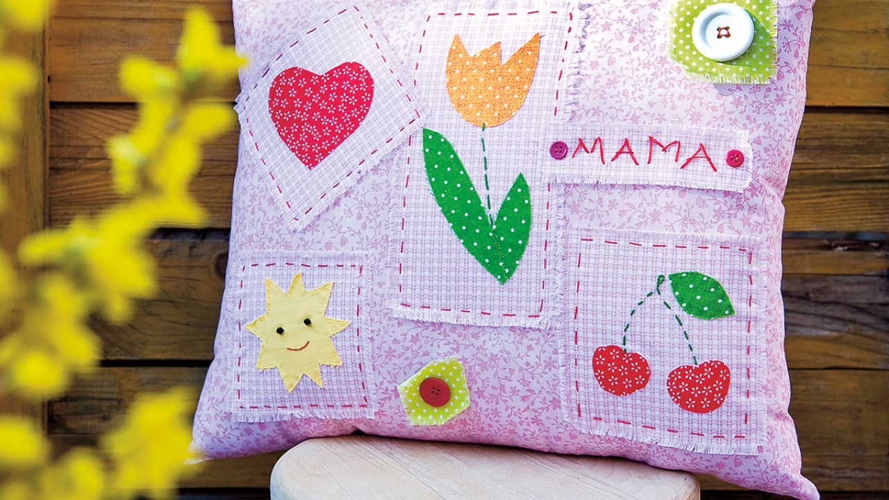 A párna vásznából vágj 2 db 45×35 cm-es darabot. Az egyiknek a színoldalán rendezd el a kirojtozott elemeket. Ahová gondolod, kisebb színes vászonnégyzeteket is tehetsz – ezeket is rojtozd ki. Gombostűzd fel mindegyiket, és a figurás darabokat fércelőöltéssel varrd körbe, piros színnel. A kisebb négyzeteket és a feliratot is egy-egy gombbal rögzítsd.