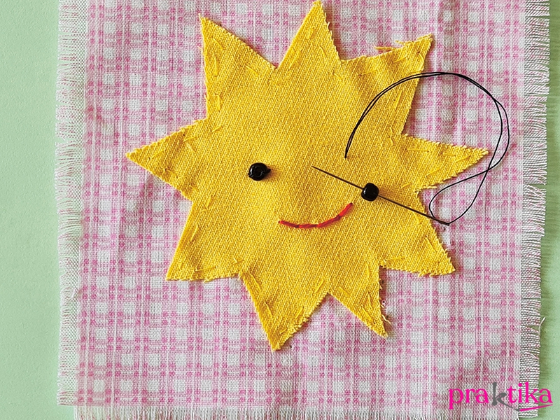 A napnak hímezz hátraöltéssel szájat és szemnek varrj fel egy-egy fekete gyöngyöt.