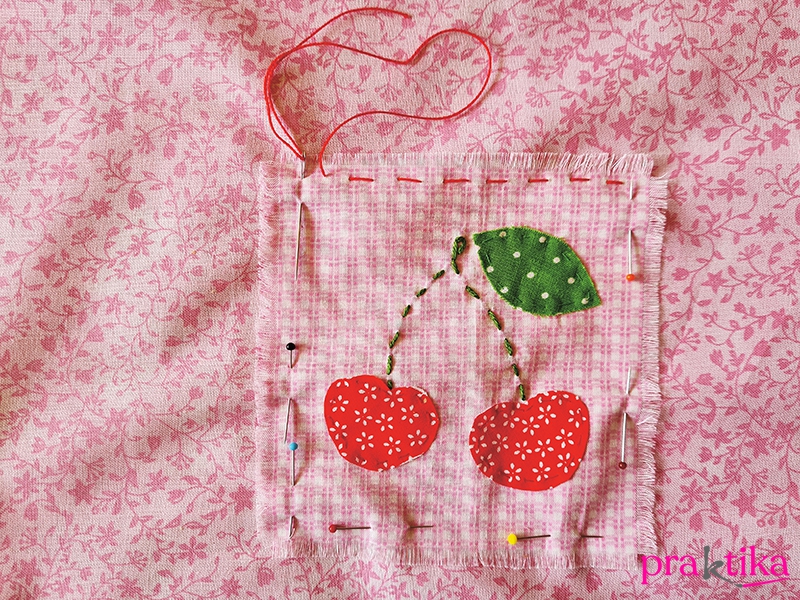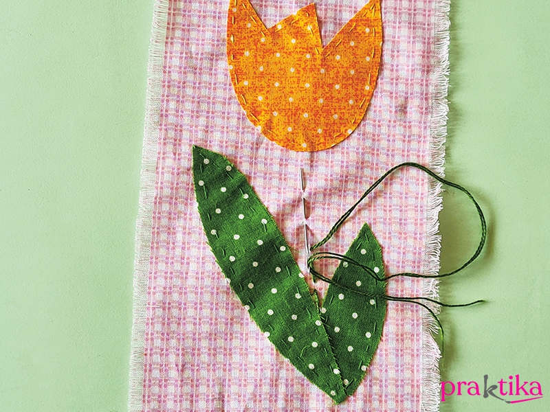 A tulipán feje és levelei közé, illetve a meggyszemek és a levelük közé fércelőöltéssel hímezd meg a szárakat.
