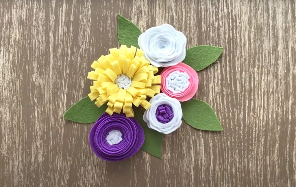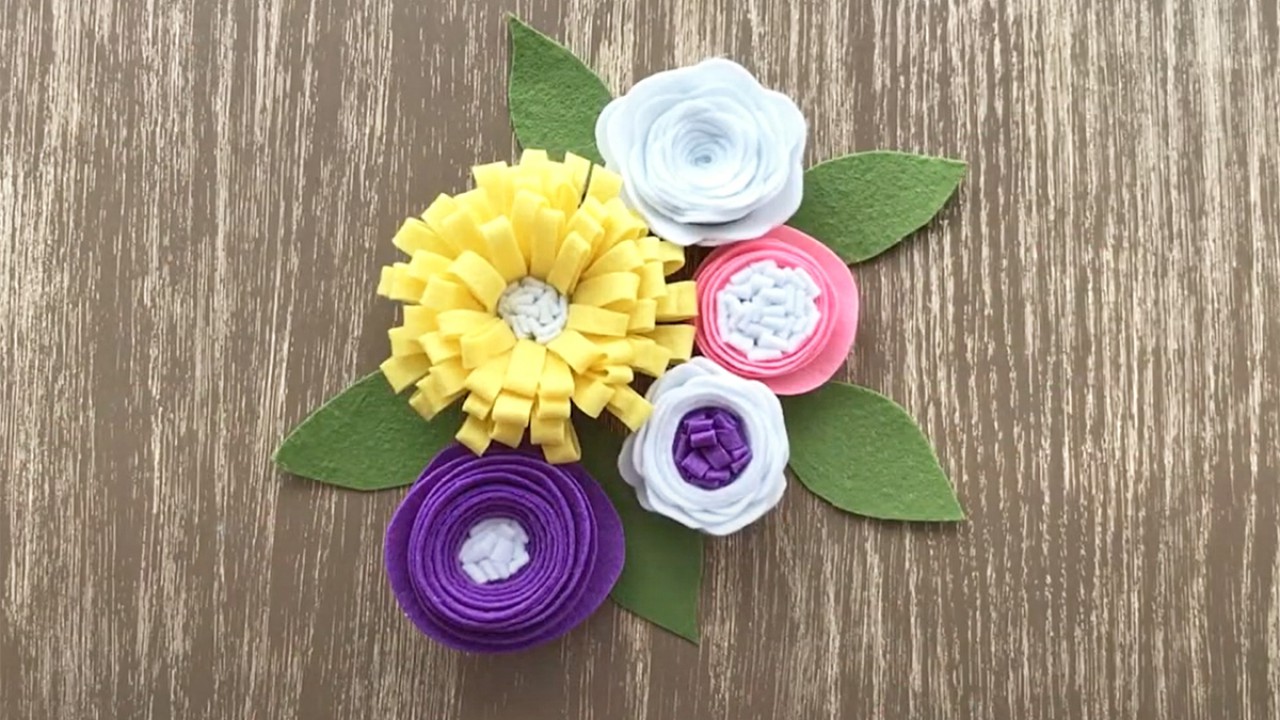 A filcvirágok közül a rózsa készül el a leghamarabb: rózsaszín filcből vágj ki egy nagyobb korongot és vágd be csigavonal mentén. Ezt követően már csak össze kell tekerned. A többihez színes filccsíkra lesz szükséged: csak hajtsd ketté hosszában és óvatosan vagdosd be a videón látható módon.