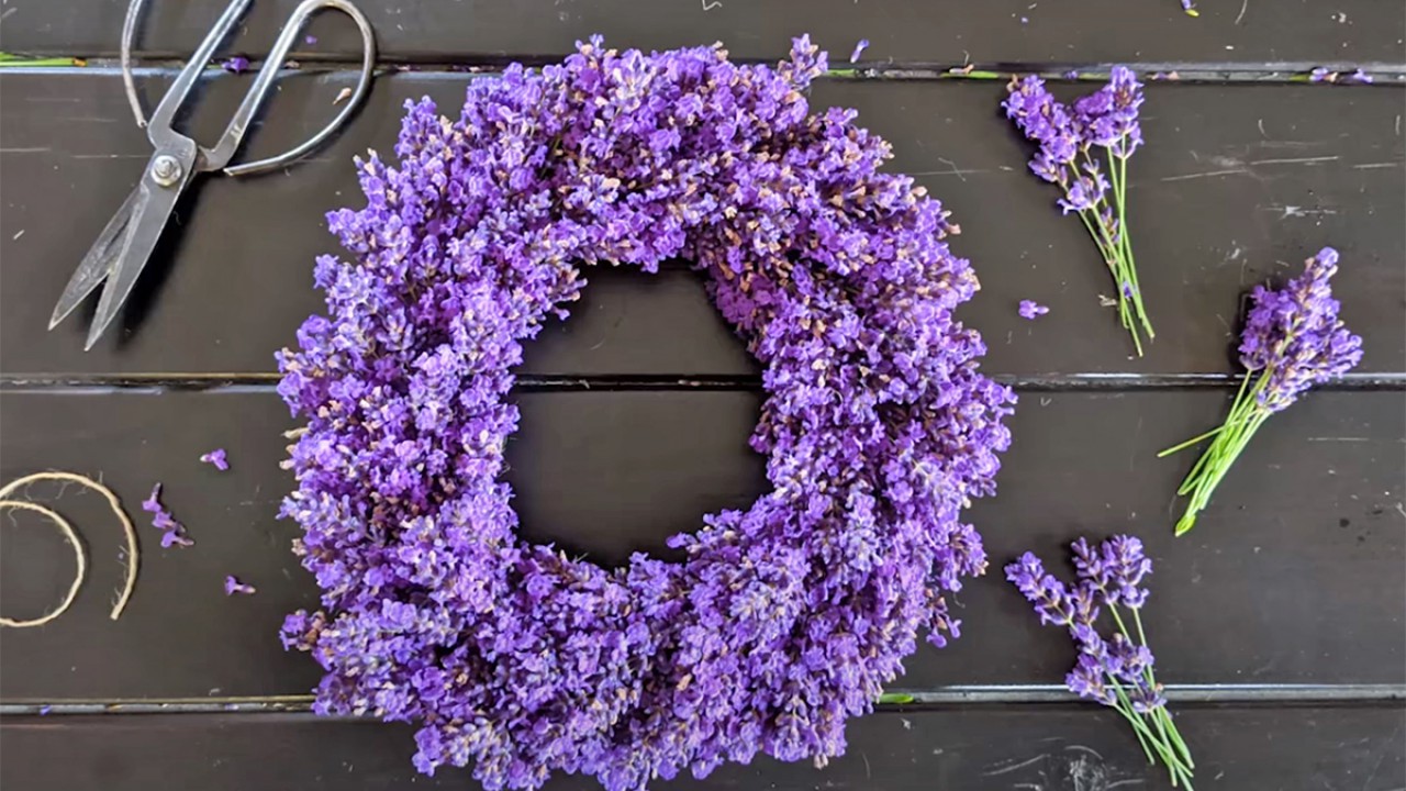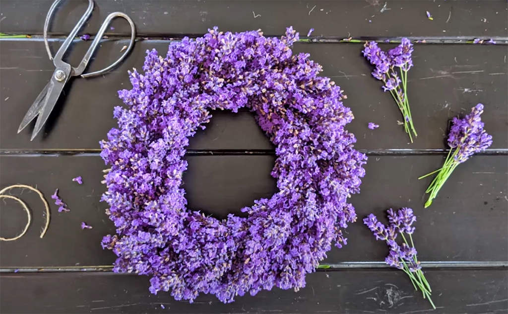 A levágott levendulákat 4-5 szálasával válogasd szét kisebb kupacokra, így egyszerűbb lesz a munka. Fogj egy vékonyabb vesszőkoszorút (egy kis kézügyességgel ezt akár te magad is megfonhatod), majd tegyél rá egy kis köteg virágot. A szárát rögzítsd zsinórral az alaphoz. A végét ne vágd le, hanem helyezd rá a következő nyalábot és folytasd körbe a kötözgetést. A kilógó szárakat utólag vágd le róla, és egy szalaggal függeszd ki az ajtódra.