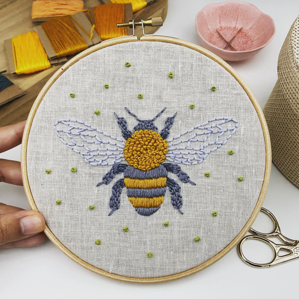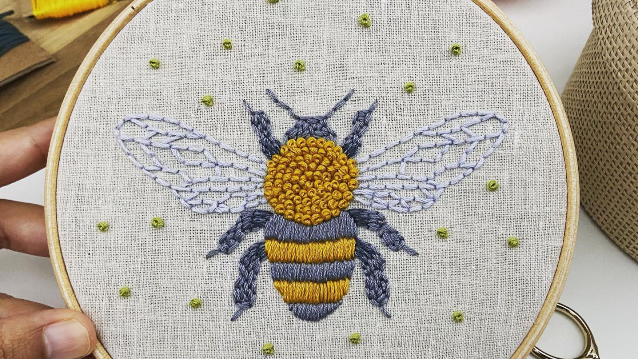 Első lépésben kattints ide, töltsd le és nyomtasd ki a méhecske sablonját (15 centiméter átmérőjű kerethez készült). Rajzold át a kifeszített vászonra ceruzával. Ennél a képnél egyszerű fonáköltéssel kell dolgozni: hímezd ki a méhecske lábait, szárnyait, potrohát a szürke különböző árnyalataival, illetve sárgával. Ezután jöhet a tor része francia csomóval, a fonalat tekerd rá a tűre, majd egy másik lyukon keresztül húzd a visszájára.