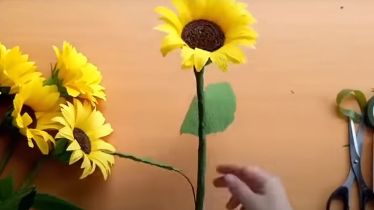 A virághoz barna, zöld és citromsárga krepp-papírra lesz szükséged. A zöldből vágj le egy hosszabb csíkot és tekerd fel a drótra, ez lesz a szára. A barna papírból vágott csíkot ollóval vagdosd be, majd beragasztózva tekerd fel lassan a drót végére. A sárga papírcsíkból formázott szirmokat tekerd eköré. Végül zölddel készítsd el a virág alatti zöld csészeleveleket. Ha kedved tartja, a szárhoz lentebb rögzíthetsz nagyobb leveleket is.