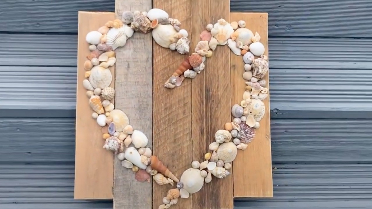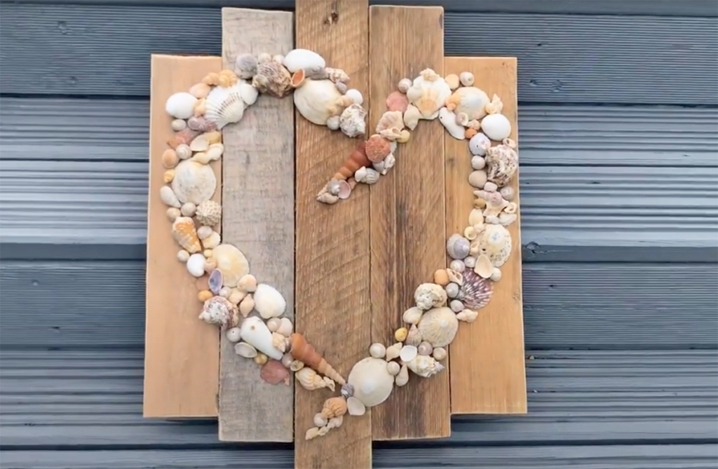 Öt lécet rögzíts egymáshoz, középre kerüljön a leghosszabb darab. Használhatsz hozzá melegragasztót, de jó megoldás az is, ha hátul, keresztben szögelsz rá egy másik lécet. Ezután jöhet a dekorálás: a kagylókat helyezd el szív formában és egyesével ragaszd fel őket. Az örök nyarat csempészheted vele otthonodba, és így talán az idő is hamarabb eltelik majd a következő nyaralásig.