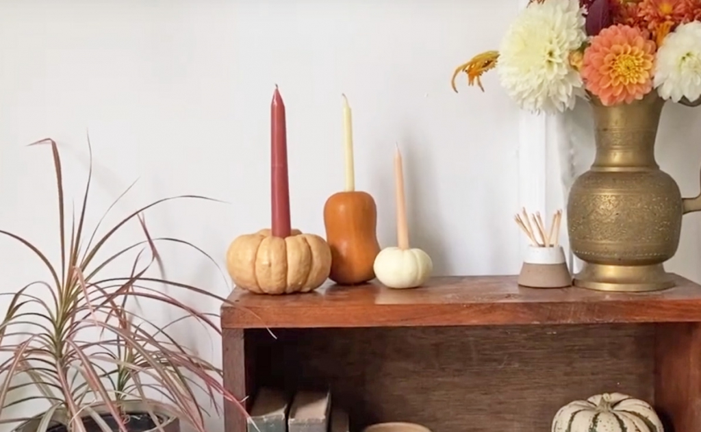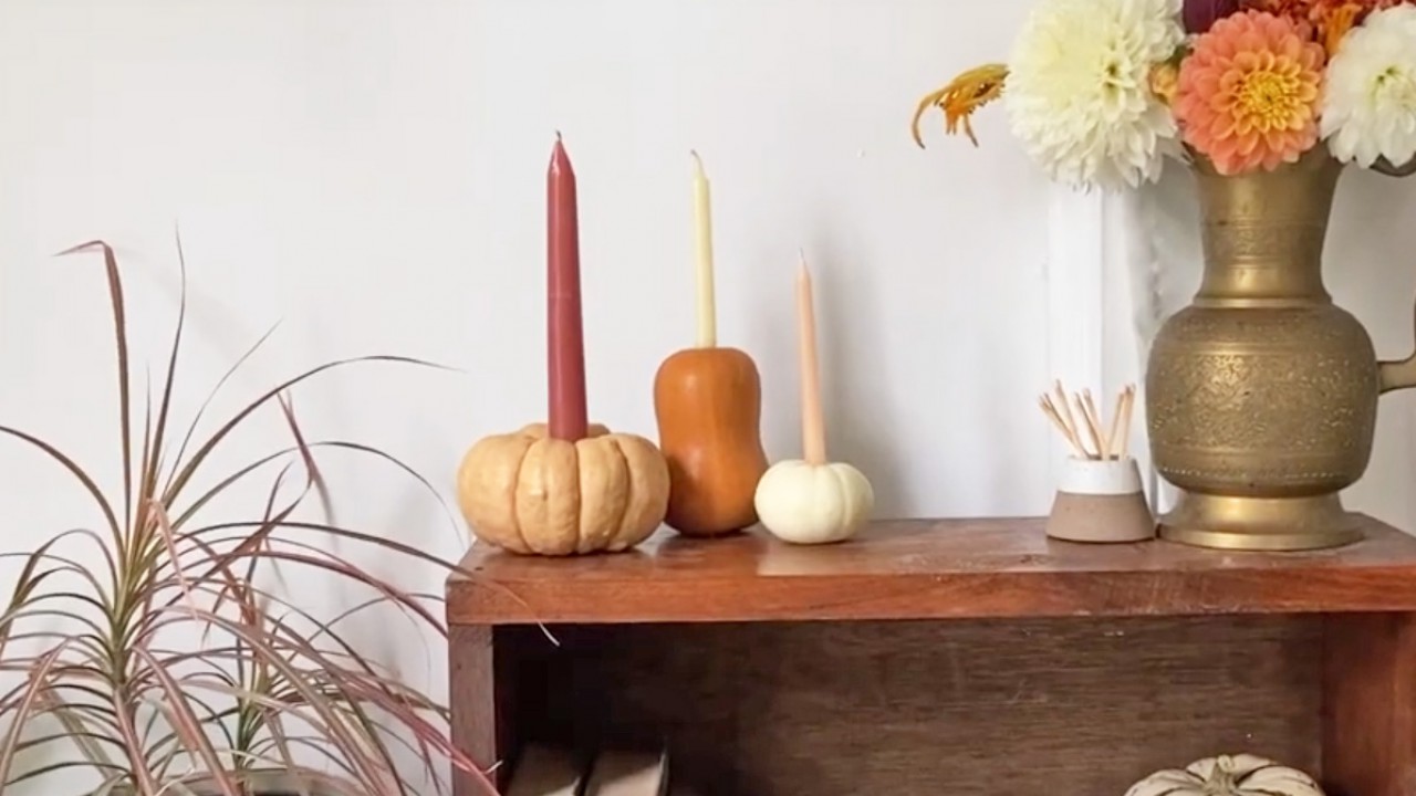 A töknek finoman távolítsd el a szárát. Ezután fogj egy fúrót és egy vastag fúrószárral fúrj lyukat a szár helyén. Óvatosan mélyítsd a lyukat, nehogy túl mélyre szaladjon vagy megsértsd az ujjadat. Ha megvagy vele, fogj egy hasonló vastagságú gyertyát és állítsd bele a tökbe. Igazán jól fog mutatni a kompozíció, ha három különböző színű és formájú tökgyertyatartót teszel egymás mellé.