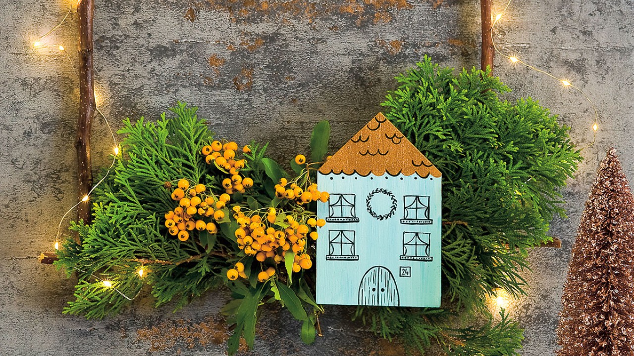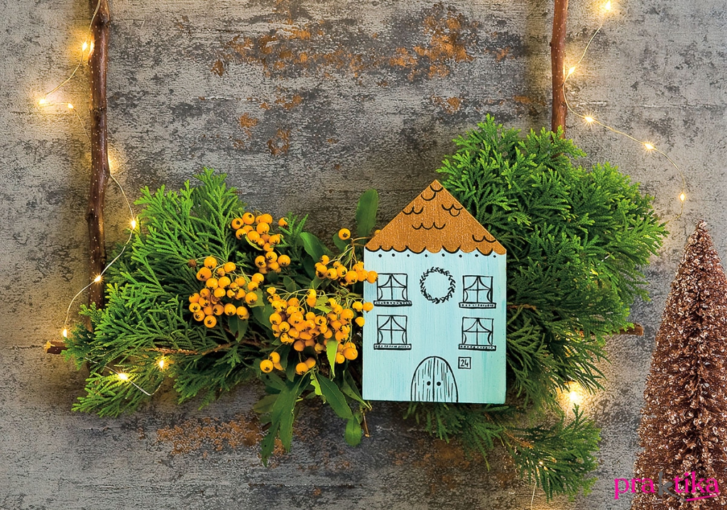 Válogasd ki a legszebb tujaágakat és bogyós gallyakat, majd vágd őket nagyjából egyforma méretűre. A vékony dróttal rögzítsd a négyszögletes alap alsó részére, kissé aszimmetrikusan: mi a jobb oldalra dúsabban raktuk a tujaágakat, hogy majd szép hátteret biztosítsanak a házikónak. Az alap hátoldalán akár melegragasztóval is megerősítheted a gallyak rögzítését.