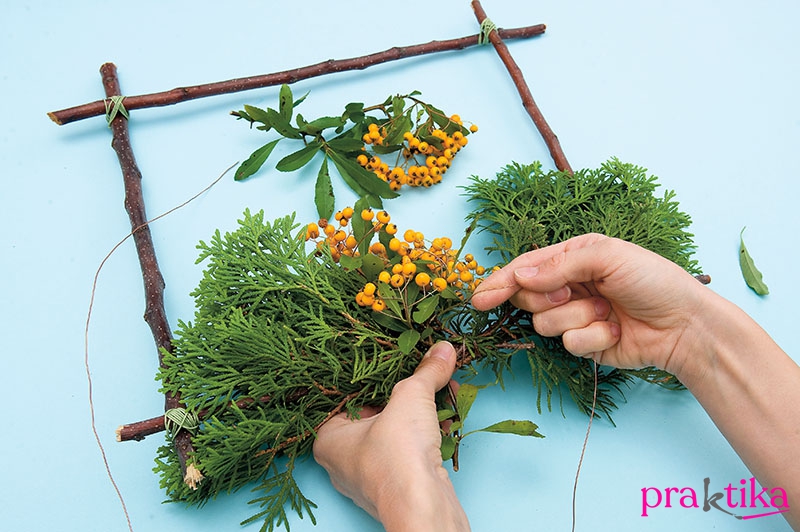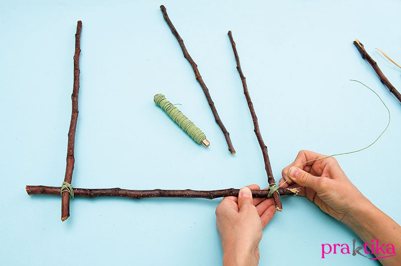 Az egyenes faágakat rendezd el négyszögletes formában, és a virágkötő dróttal rögzítsd a sarkokat a képen látható módon: keresztezd a drótot többször, hogy stabil legyen.