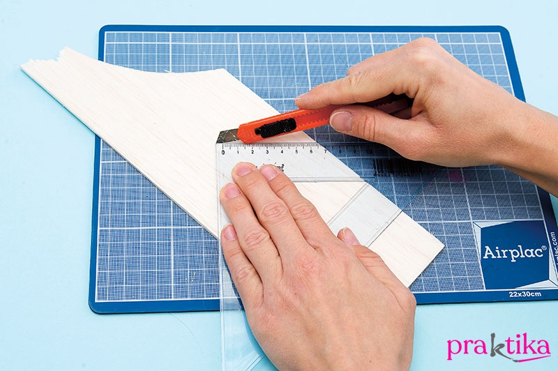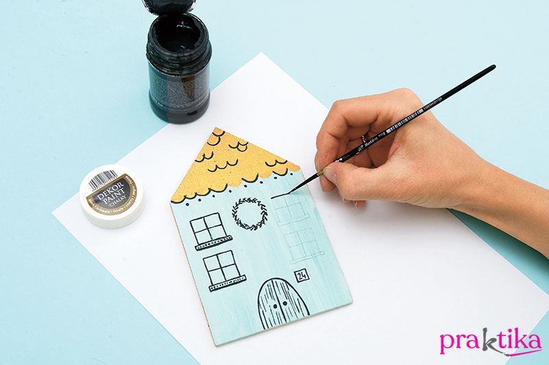 Rajzold meg és vágd ki a házikót balsafából: vágólapon, éles hobbikéssel dolgozz. Akrilfestékkel színezd tetszés szerint a házikót: mi az alapot türkizkékre, a tetőt pedig aranyszínűre festettük. Miután a festék megszáradt, szabad kézzel vagy indigó segítségével a sablonívről átmásolva díszítsd ki a házat az apró mintákkal. A fekete vonalakat nagyon vékony ecsettel és fekete akrilfestékkel készítheted el, de használhatsz fekete alkoholos filctollat is.