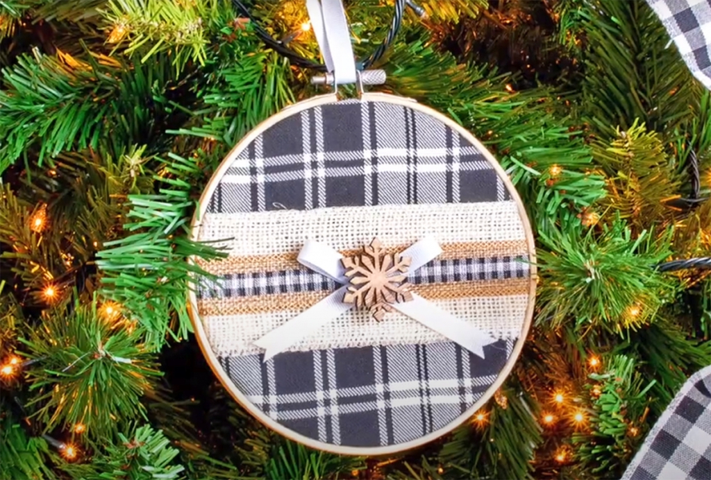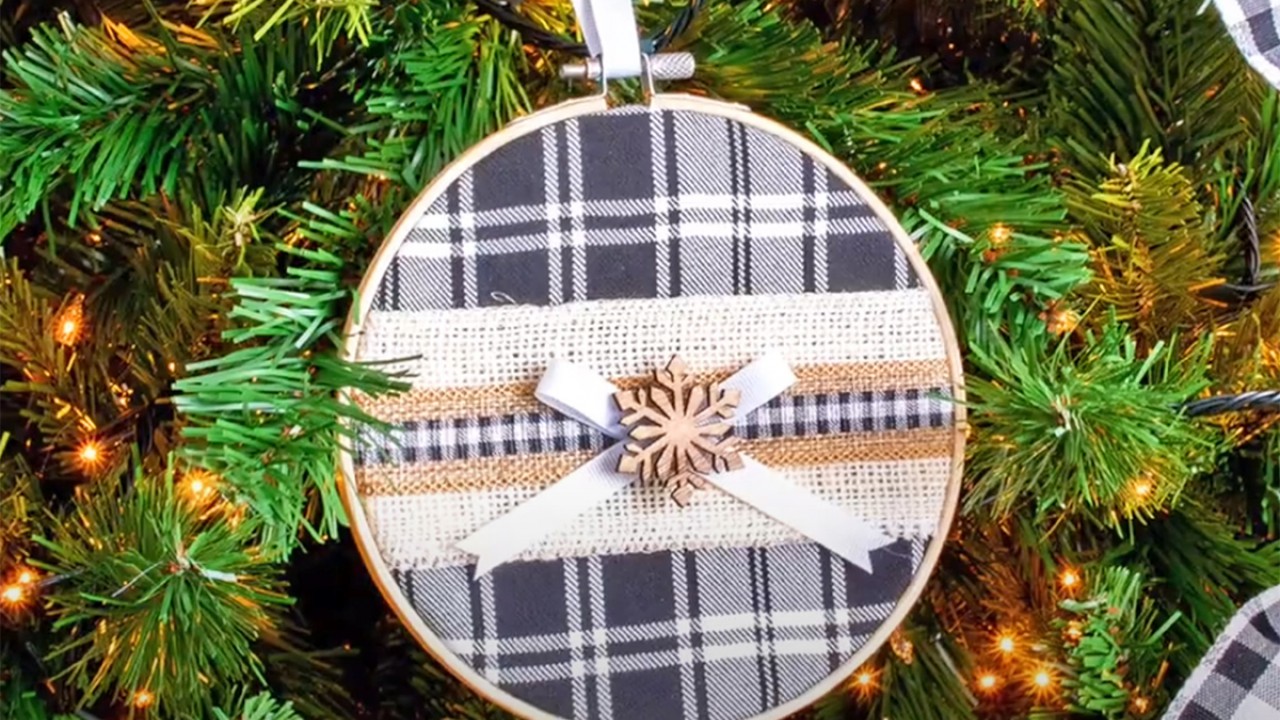 Ehhez a díszhez kisebb vagy nagyobb hímzőkeretre, kockás textilre és zsákvászonszalagra lesz szükséged. A textilre helyezd rá vízszintes sávokban a szalagokat, majd óvatosan rögzítsd a rámába. Ezután tetszés szerint díszítsd: tehetsz rá masnit és ragaszthatsz rá aprócska karácsonyi motívumokat is. Ha végeztél, ollóval vágd ki a lelógó részeket a textilből. Felakaszthatod majd a karácsonyfára, de a falon is jól mutat.