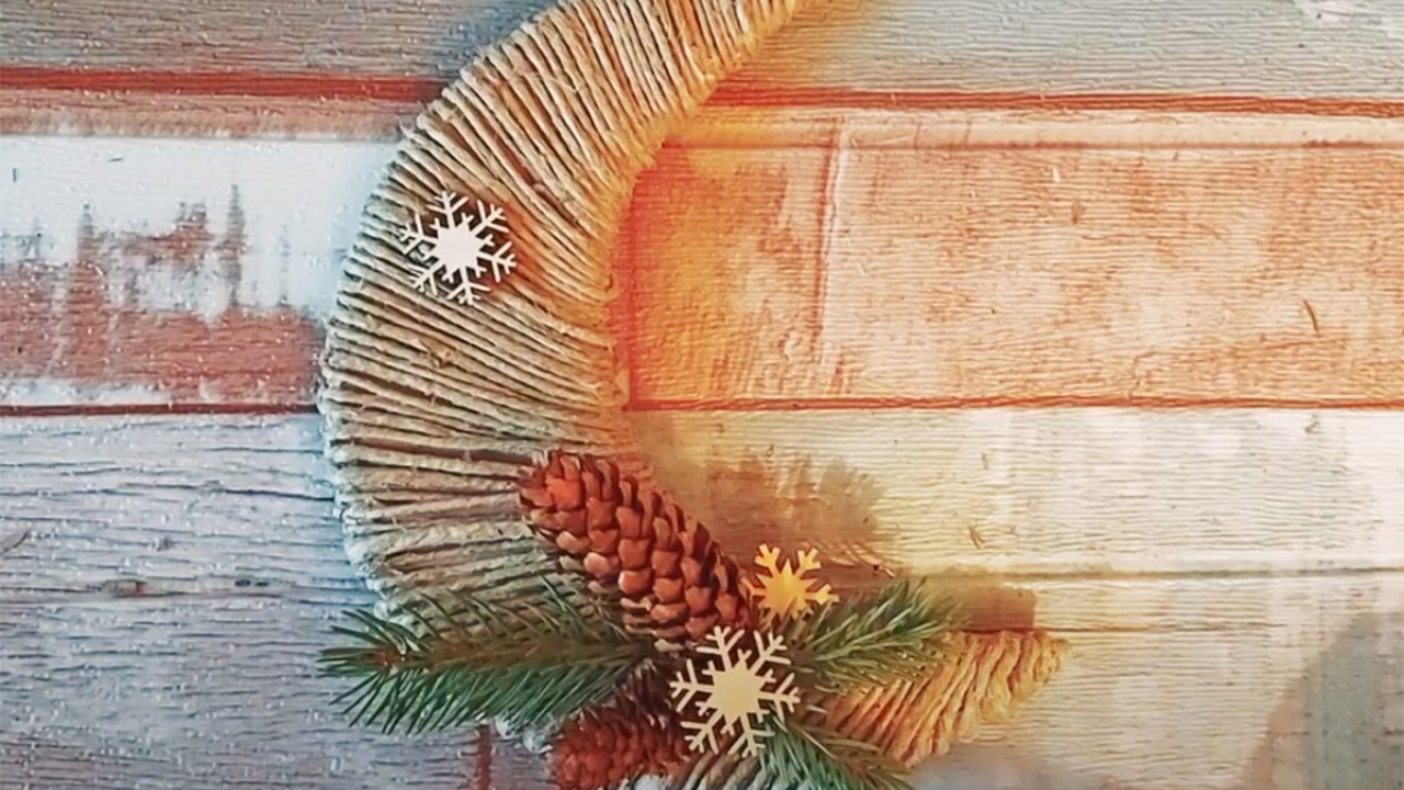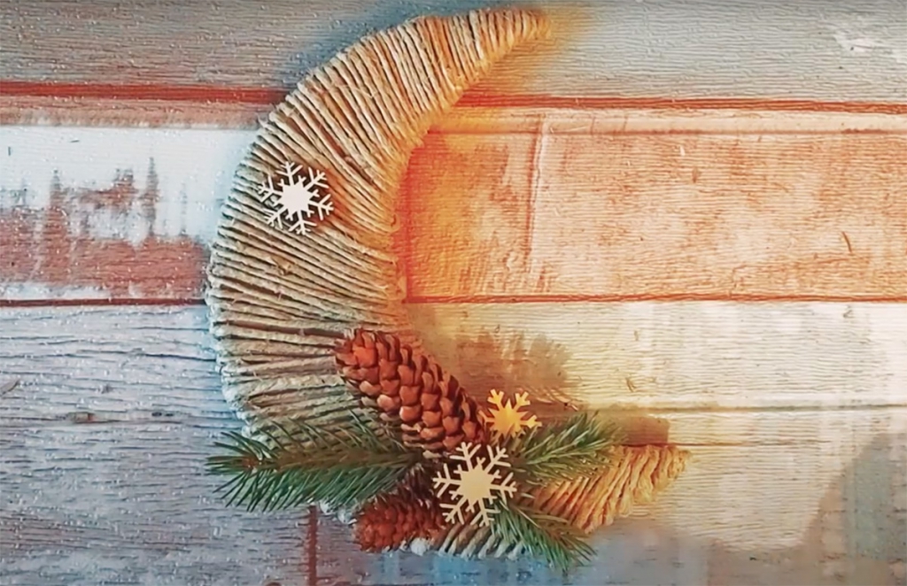 Egy kartonlapra rajzold fel a félhold formáját. Megpróbálhatod szabadkézzel, de egy tányér vagy egy körző is segíthet benne. Vágd ki a formát, majd spárgával kezdd el körbetekerni: a csúcsához nyomj egy kevés melegragasztót, hogy rögzítsd. Ha elkészült, már csak a díszítés hiányzik, rögzíts hozzá egy-egy kisebb fenyőágat, tobozt, hópihedekort. Végül akaszd ki az ajtóra.